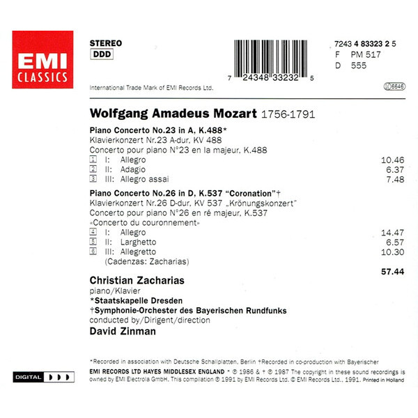 Концерты для фортепиано с оркестром композитора Вольфганга Амадея Моцарта в исполнении пианиста Кристиана Закариаса, с участием Саксонской государственной капеллы, симфонического оркестра Баварского радио и под руководством дирижера Дэвида Зинмана. Записи сделаны в 1986 и 1987 году.