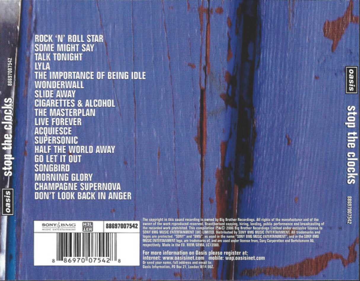 "Stop The Clocks" - сборник лучших хитов рок-группы Oasis, выпущенный в 2006 году. Основной костяк сборника составили песни с классических альбомов "Definitely Maybe" 1994-го и "(What's the Story) Morning Glory?" 1995-го года, а также бисайды синглов того периода. В пресс-релизе было сказано, что группа уходит в творческий отпуск для того, чтобы потом с новыми силами взяться за работу над новым материалом, а этот сборник - шанс для всего мира ещё раз увидеть то, что группа сделала и делает для рок-н-ролла и понять, почему Oasis являются одной из самых успешных рок-групп мира.