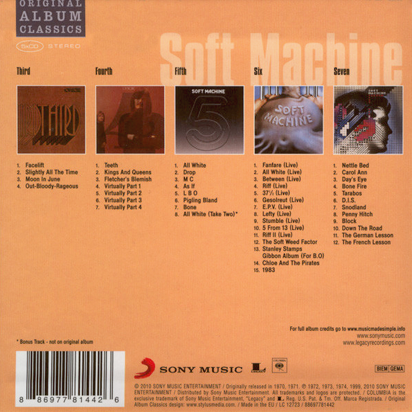 Бокс-сет "Original Album Classics" британской рок-группы Soft Machine. В сборник вошли 5 ремастированных альбомов: "Third" (1970), "Fourth" (1971), "Fifth" (1972), "Six" (1973) и "Seven" (1973). На альбоме "Fifth" присутствует бонус-трек "All White (Take Two)". Три последних пластинки записывались уже после ухода Роберта Уайетта, одного из лидеров команды. Альбом "Third" стал самым коммерчески успешным в карьере группы (на территории США он продавался на протяжении 10 лет).