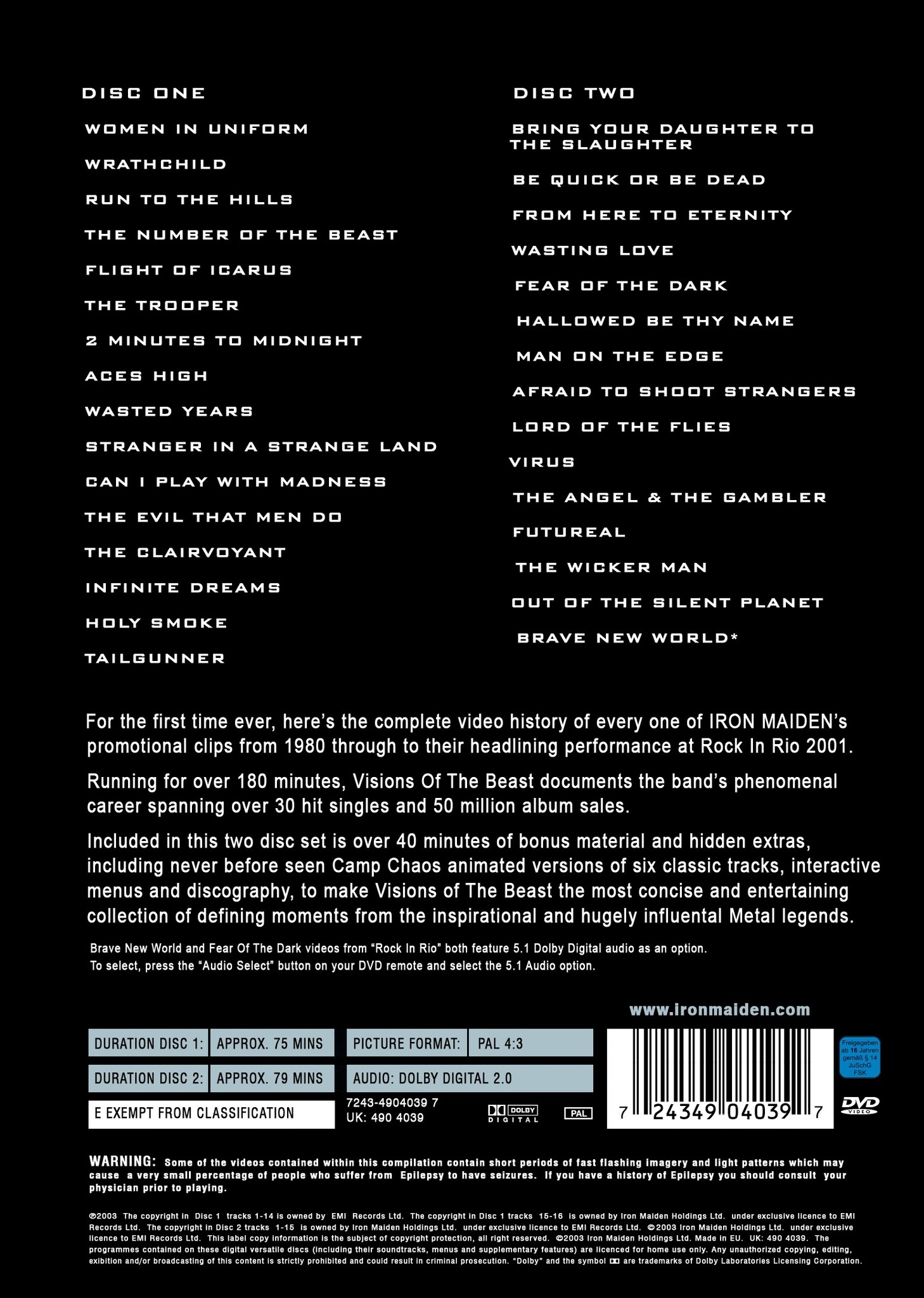 "Visions Of The Beast" - избранное собрание промо видеоклипов британской рок-группы Iron Maiden, вышедшее в 2003 году. Релиз содержит полную видео историю всех клипов Iron Maiden, созданных с 1980 по 2001 год, 40 минут бонусного материала и скрытые дополнительные материалы, включая ранее не публиковавшиеся анимированные "Camp Chaos" версии шести классических треков и дискографию. Песни "Fear Of The Dark" и "Brave New World" взяты с концертного DVD "Rock In Rio".