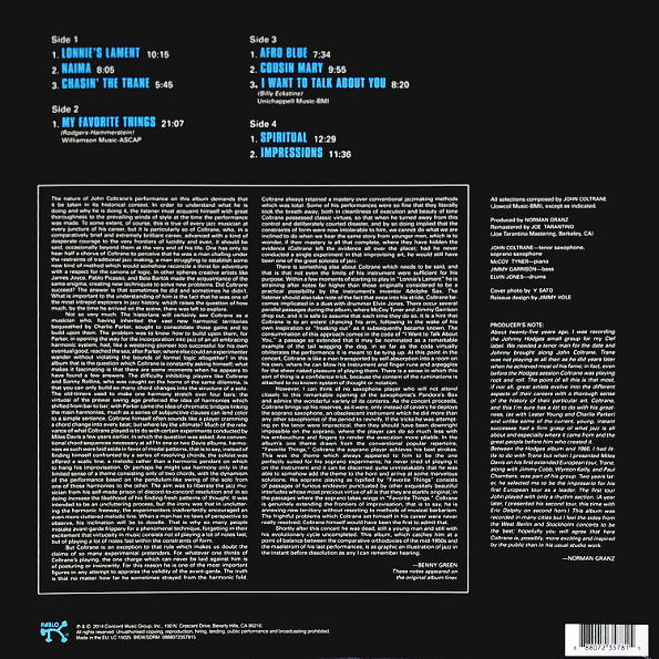"Afro Blue Impressions" является альбомом, созданным и записанным в период гастрольных турне музыканта и выпущенным уже в 1963 году. Виниловое издание включает в себя 9 оригинальных треков, в том числе такие знаменитые произведения, как: "Lonnie's Lament", "My Favorite Things" и "Impressions".