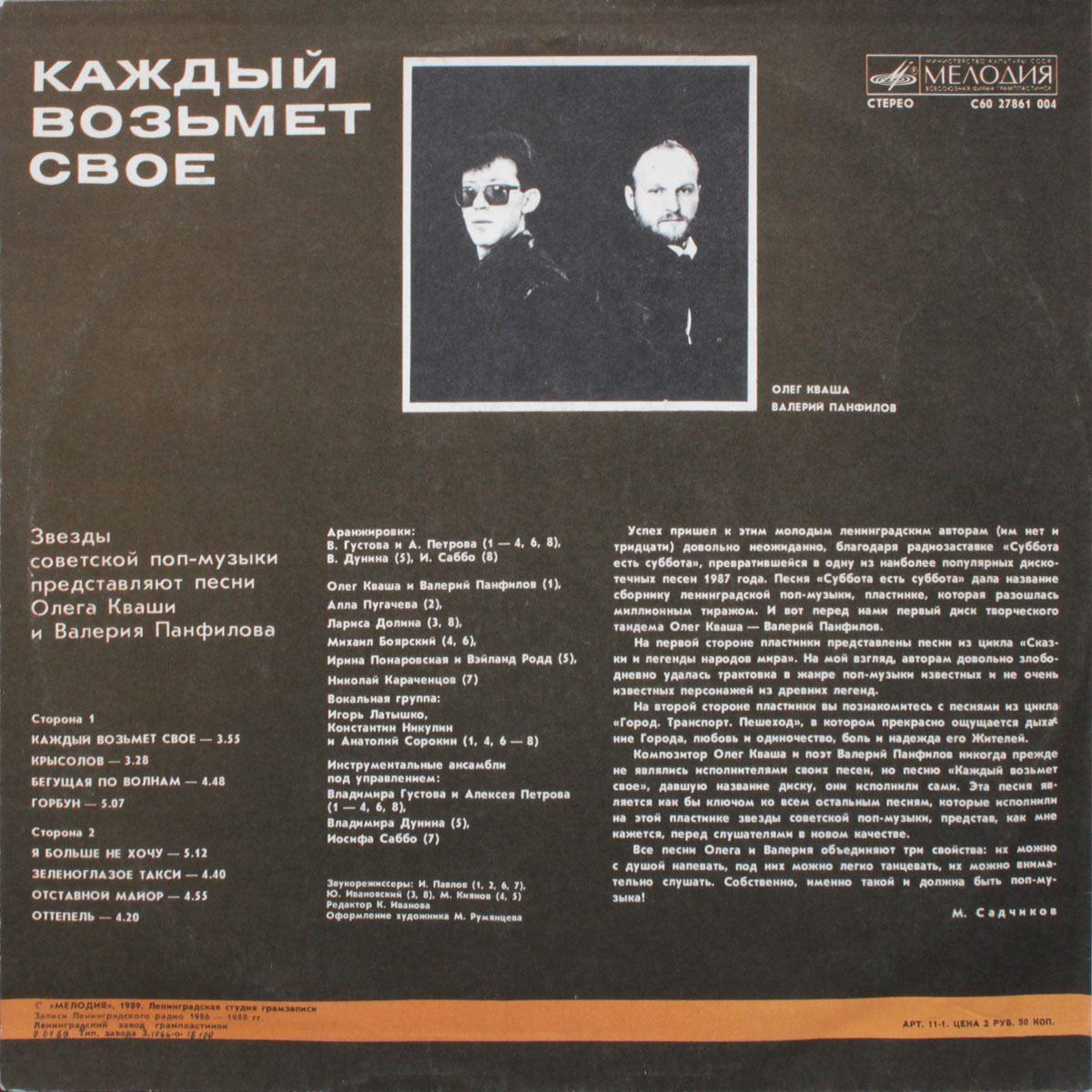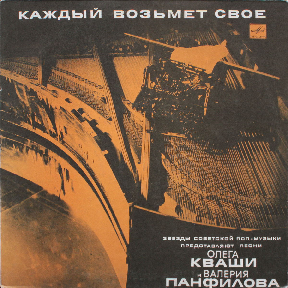 "Каждый Возьмет Свое" - сборник песен Олега Кваши и Валерия Панфилова, выпущенный в 1989 году. Сборник включает песни в исполнении звёзд советской поп-музыки, таких как Алла Пугачёва, Лариса Долина, Михаил Боярский, Николай Караченцов и другие.Издание на чёрном виниле. Конверт в состоянии, близком к идеальному, винил в превосходном состоянии.Валерий Панфилов - советский и российский поэт, автор популярных песен, тележурналист, писатель. Валерий Панфилов получил известность как поэт-песенник в конце 1980-х годов благодаря таким хитам, как "Зеленоглазое такси", "Каждый возьмёт своё", "Горбун", "Отставной майор", "Крысолов" и многим другим, которые были написаны им совместно с композитором Олегом Квашой. Песни на стихи Валерия Панфилова входят в репертуар Аллы Пугачёвой, Михаила Боярского, Николая Караченцова, Ларисы Долиной, Игоря Скляра и других знаменитых артистов.Олег Кваша - советский и российский музыкант и композитор, автор песен "Зеленоглазое такси", "Суббота есть суббота", "Я больше не хочу тайком любить", "Санкт-Петербург гордая белая птица" и т. д.