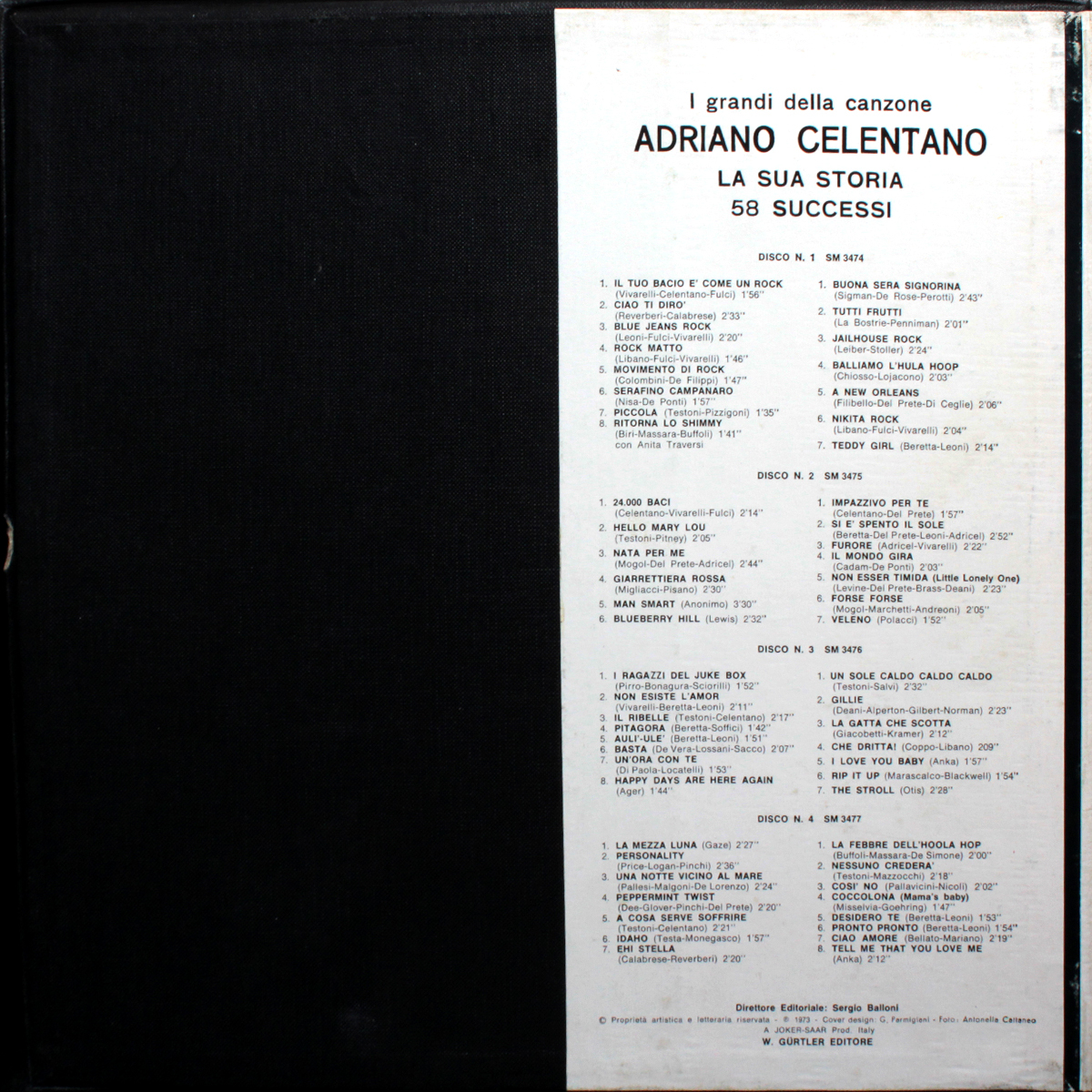 La Sua Storia (58 Successi) - сборник хитов Адриано Челентано, вышедший в 1974 году. Издание представлено в виде бокс-сета и включает четыре чёрных винила в бумажных конвертах. Бокс и винил в состоянии близком к идеальному. Адриано Челентано - итальянский певец, музыкант, киноактёр, кинорежиссер, общественный деятель. Его первый сингл вышел в 1958 году, а дебютный диск - в 1960. Помимо успешной кино карьеры Челентано стал знаменит как исполнитель на итальянском языке первых рок-н-роллов, лирических баллад, музыки в стиле диско, популярных и народных песен. В 1961 году Адриано создает свой собственный лейбл Clan Celentano, на котором многие годы выпускает свои альбомы. Крупные лейблы тоже выпускали пластинки певца, ставшего настоящей легендой. Так, последний на момент написания текста, альбом Челентано "Le migliori" (2016) вышел на Sony Music. Общий тираж альбомов музыканта превышает 70 миллионов экземпляров, всего его последние альбомы стабильно получали мультиплатиновый статус в родной Италии.