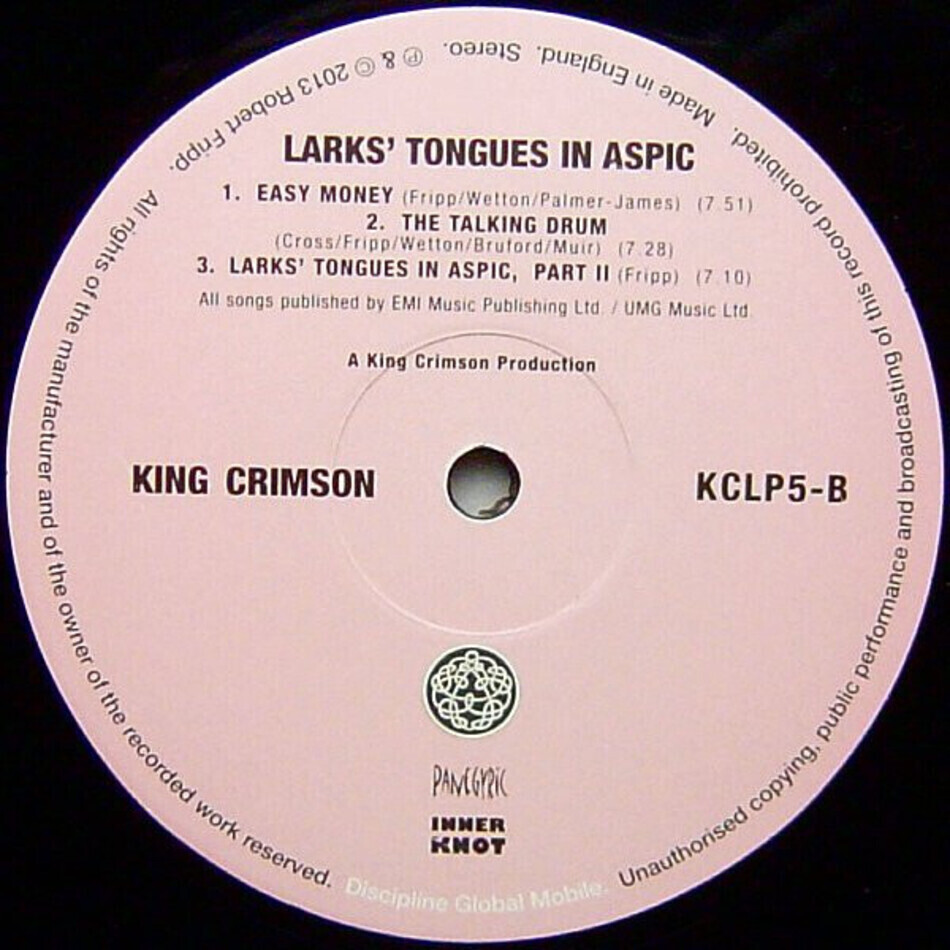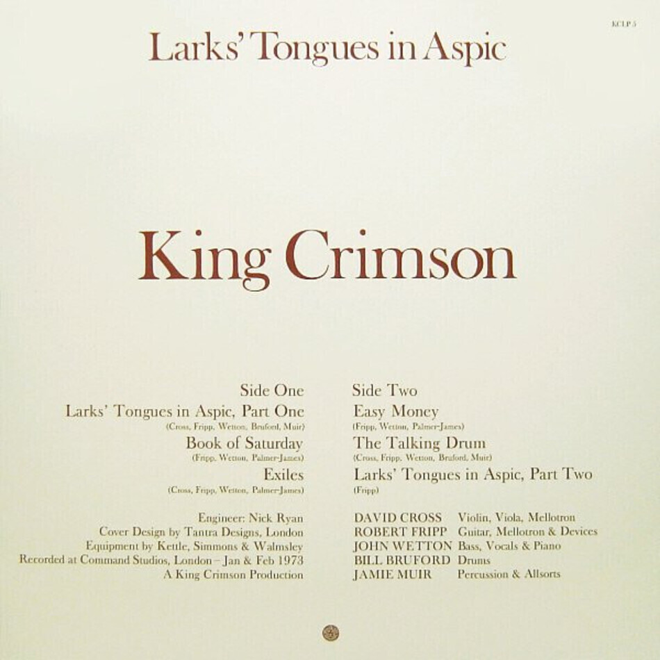 "Larks' Tongues In Aspic" - пятый студийный альбом рок-группы King Crimson, выпущенный в 1973 году. При записи пластинки группа в очередной раз сменила состав (уже третий раз), из оригинальной команды остался только гитарист Роберт Фрипп. До сих пор композиции из этой работы перепеваются другими коллективами.