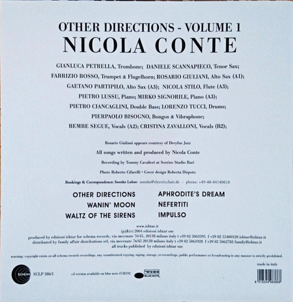 "Other Directions - Volume 1" - студийный альбом итальянского музыканта Николы Конте, первоначально выпущенный в 2004 году. Вокал - Бембе Сеге, Кристина Заваллони, Лиза Бассенж, Люсия Минетти, Тилль Брённер. Все сессии записаны в Sorriso Sound - Бари в Италии, февраль 2003 г. - январь 2004 г.