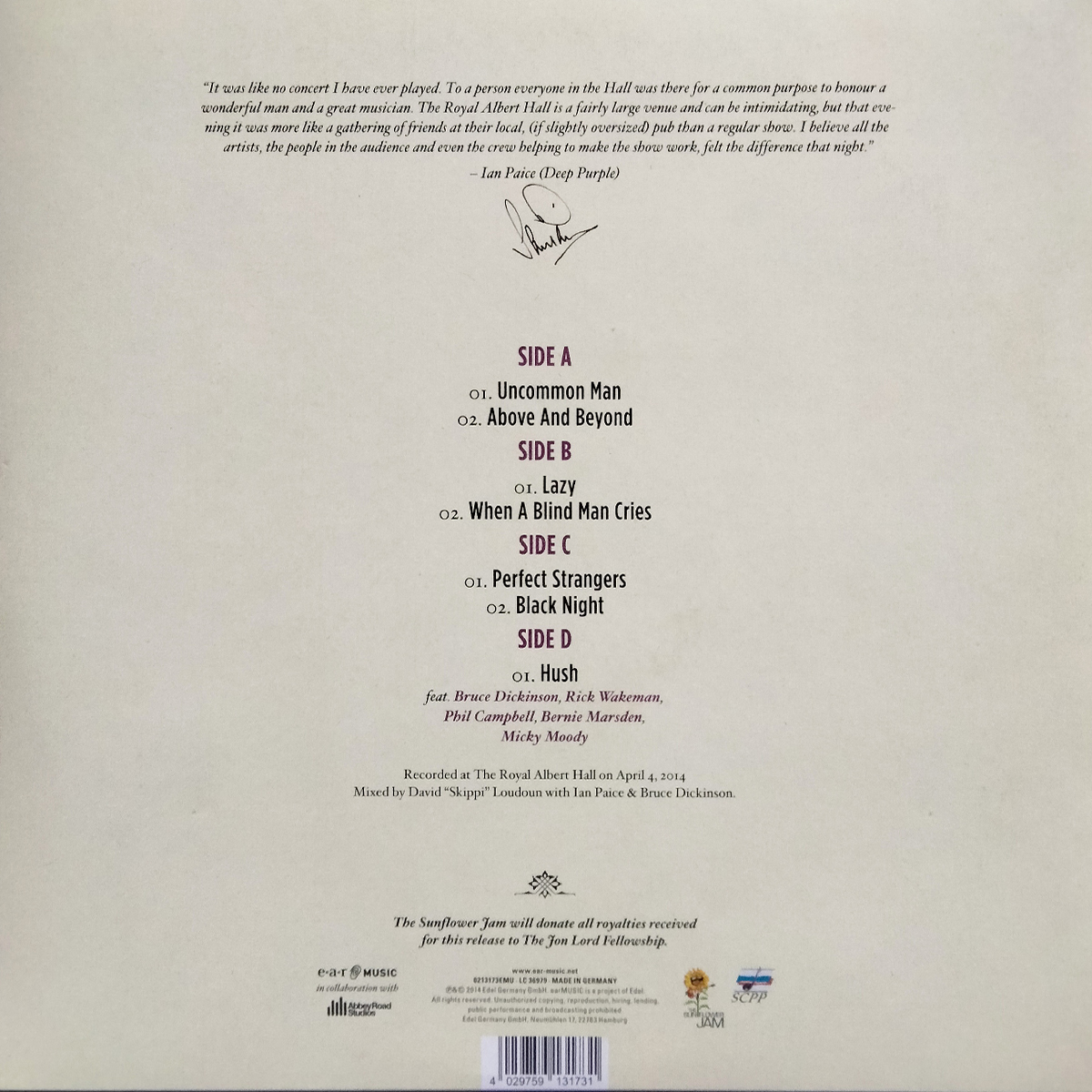 "Celebrating Jon Lord - The Rock Legend Vol.2" - вторая часть шоу "The Sunflower Jam" с участием музыкантов и друзей группы Deep Purple и других великих исполнителей, выпущенная в 2018 году. Запись сделана в Альберт-холле 4 апреля 2014 года. Релиз представляет классические рок-композиции, которые были написаны Джоном Лордом. Среди участников концерта известные музыканты Рик Уэйкман, Брюс Дикинсон, Берни Марсден, Мик Муди.
