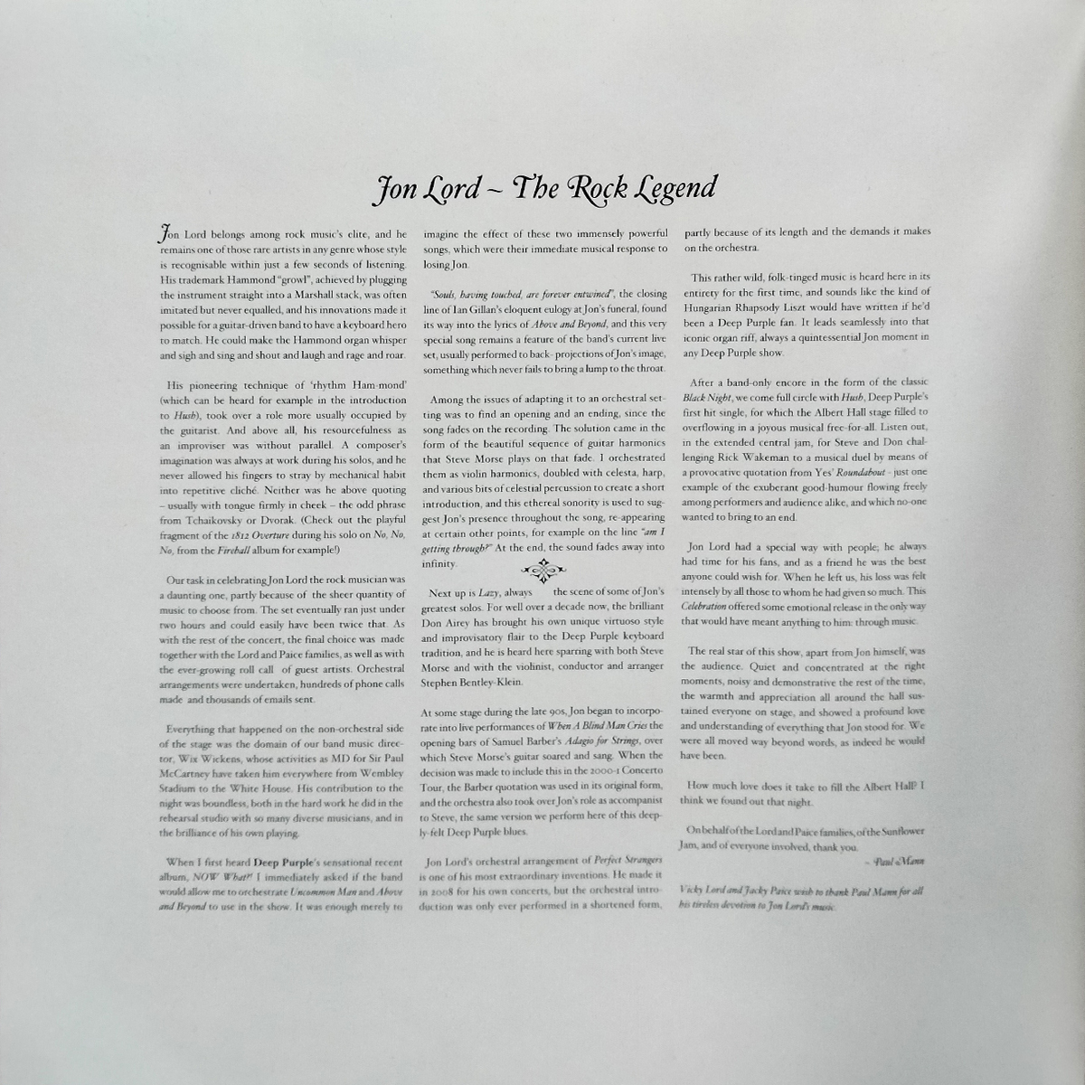 Джон Лорд - выдающийся британский композитор и клавишник, наиболее известен участием в группе Deep Purple. Также был участником групп Artwoods, Flower Pot Men, Paice, Ashton & Lord, Whitesnake. С 2002 года сосредоточился на сольной карьере. Стиль игры Джона Лорда легко узнаваем, как из-за характерного звука Хаммонд-органа, часто используемого музыкантом для исполнения, так и из-за заметного влияния классических композиторов и джаза на произведения музыканта.