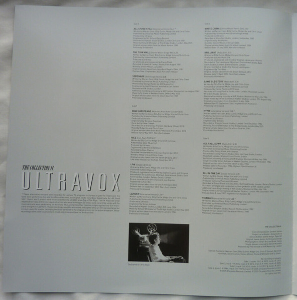 "The Collection" - сборник группы Ultravox, выпущенный в 1984 году. В релиз вошли первые 14 синглов группы, выпущенные в период с 1980 по 1984 год. Среди наиболее известных треков - культовая песня "Vienna", гимн против ядерной войны "Dancing With Tears In My Eyes", классика новой волны "All Stood Still", а также "Hymn", "The Voice" и "Reap The Wild Wind".