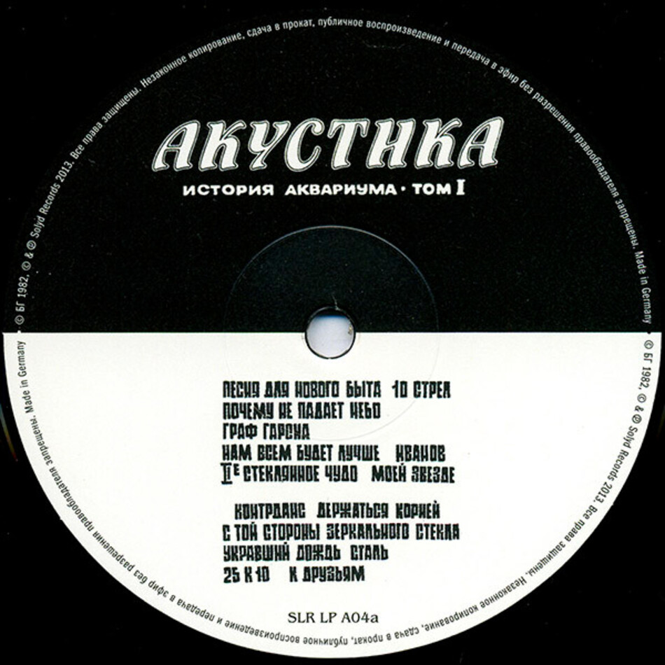 "История Аквариума: Том 1 - Акустика" - сборник рок-группы Аквариум, выпущенный в 1982 году. Релиз стал сборником песен, которые группа исполняла на домашних концертах конца 70-х - середины 80-х годов, а потому успели ранее уже разойтись по стране в виде самопальных записей чудовищного качества, с разным набором песен и вариаций - даже "канонических вариантов" было несколько. Причём альбом "Электричество. История Аквариума - Том 2" вышел раньше "Акустики". Весь материал "Акустики" был записан в 1981 году, в 82-м добавилась песня "Контрданс", но большая задержка с его выходом получилась из-за шумов - в изначальной версии альбома между песнями был записан шум воды.