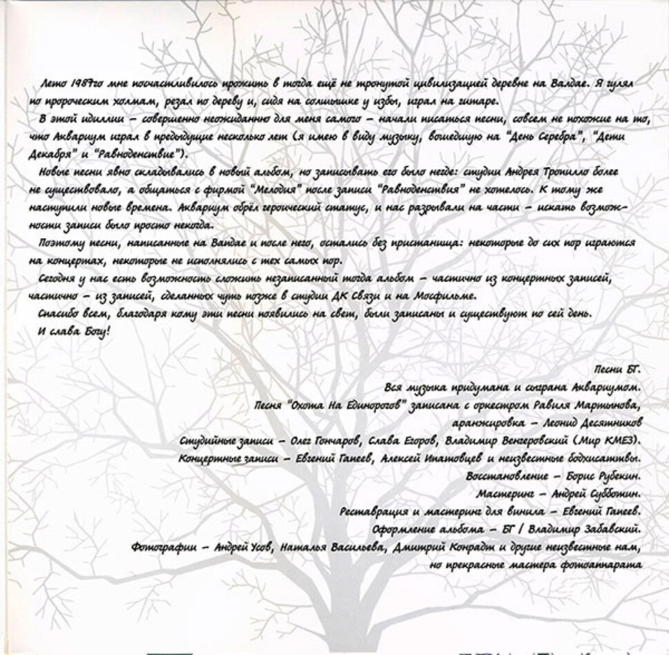 Аквариум - одна из старейших отечественных рок-групп, свою деятельность она начала в 1972 году. За время своей деятельности сама группа (чей состав постоянно менялся) и её бессменный лидер Борис Гребенщиков уже стали легендами. Творчество коллектива и сам БГ оказали огромное влияние на советскую и российскую музыку, их композиции зачастую перепеваются другими музыкантами, цитируются в книгах и периодической печати.