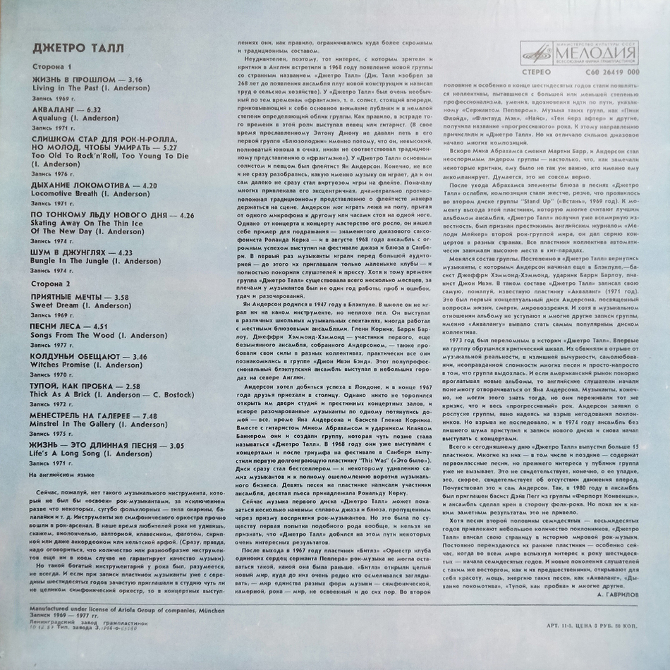 "Джетро Талл" - советское переиздание сборника "Original Masters" группы Jethro Tull, выпущенного в 1985 году. Это был третий подобный релиз группы после "M.U. - The Best of Jethro Tull" (1969-1975, выпущен в 1976 году) и "Repeat - The Best of Jethro Tull - Vol II" (1969-1975, выпущен в 1977 году). Записи 1969-1976 года.