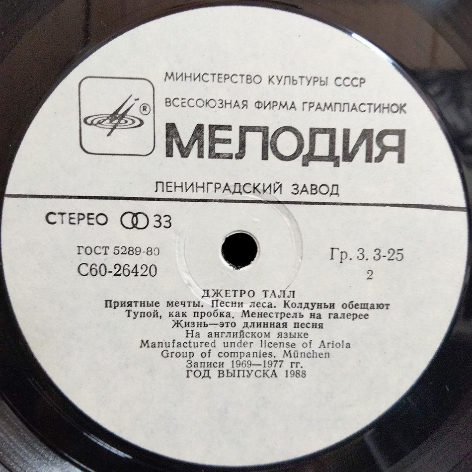 Советское повторное издание 1988 года на чёрном виниле. Конверт и винил в состоянии, близком к идеальному. Конверт в ПВХ пленке. Лейблы белые.
