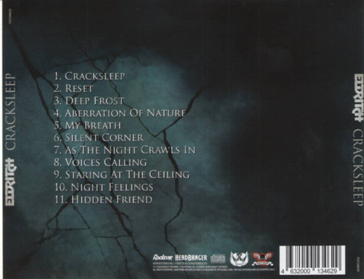 "Cracksleep" - одиннадцатый полноформатный альбом итальянской группы Eldritch, выпущенный в 2018 году. Сведением и мастерингом которого (как и в случае предыдущей работы "Underlying Issues" 2015 года) занимался гитарист DGM Симоне Муларони в "Domination Studio" (Vision Divine, Secret Sphere, Elvenking).