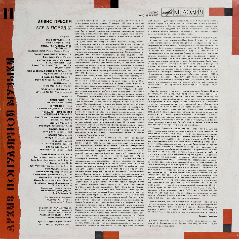 "Все В Порядке" - оригинальный сборник хитов в исполнении Элвиса Пресли, вышедший в 1989 году. Релиз содержит лучшие записи Элвиса Пресли периода 1954-1958-х годов. Содержит такие треки как "That's All Right", "Heartbreak Hotel", "Blue Suede Shoes" и многие другие. Релиз серии Архив Популярной Музыки, № 11.