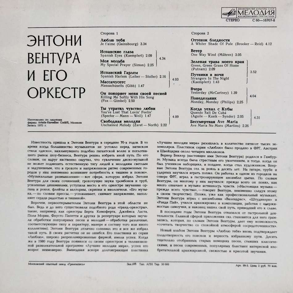 "Энтони Вентура и Его Оркестр" - советское переиздание студийного альбома "Je T'aime " Оркестра Энтони Вентуры, выпущенный в 1973 году. Запись 1973 года.