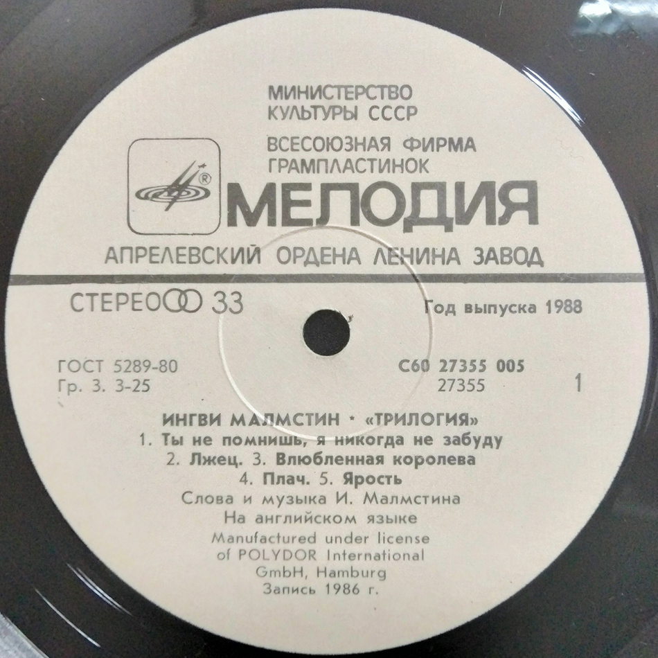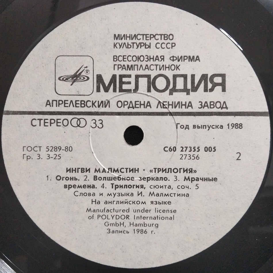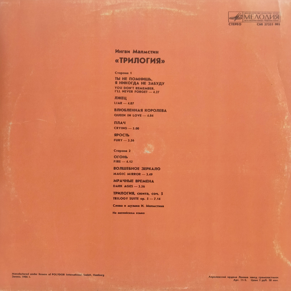 "Трилогия" - советское переиздание третьего студийного альбома "Trilogy" шведского гитариста-виртуоза Ингви Мальмстина, выпущенного в 1986 году. Является одним из первых и немногих зарубежных хэви-метал альбомов, выпуск которых был официально разрешен на территории СССР. Пластинка выпущена в 1988 году фирмой Мелодия. В 1989 году Ингви впервые посетил СССР с туром "Live in Leningrad: Trial By Fire". Альбом посвящён памяти премьер-министра Швеции Улофа Пальме, застреленного в Стокгольме 26 февраля 1986 года. Запись 1986 года.