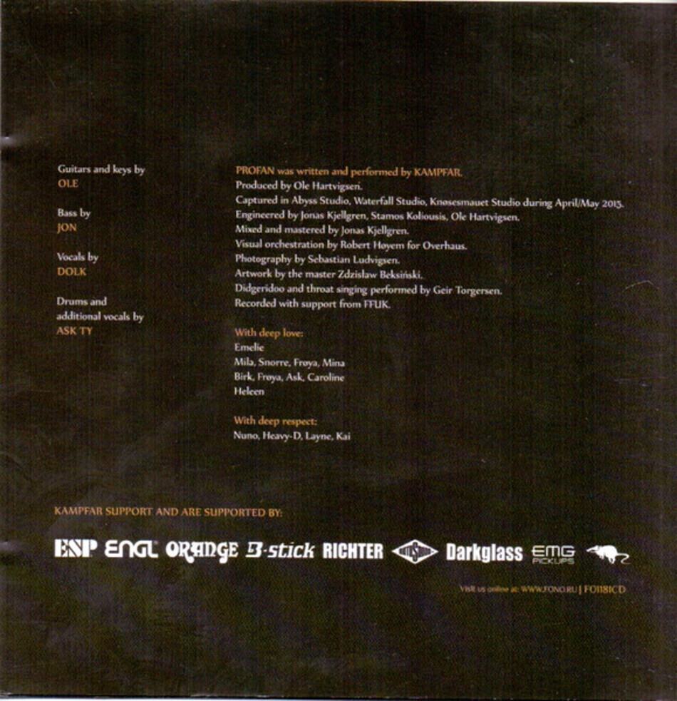 "Profan" - седьмой студийный альбом норвежской блэк-метал-группы Kampfar, выпущенный в 2015 году. Запись проходила с апреля по май в трех разных студиях Швеции и Норвегии. Сведением и мастерингом нового альбома вновь занимался Джонас Кхелгрен, бывший гитарист и основатель Scar Symmetry, работавший с Katatonia, Immortal и многими другими. Как и в случае предыдущего релиза "Djevelmakt" (2014), для оформления "Profan" использовались фрагменты картин польского художника и фотографа Здзислава Бексиньски.