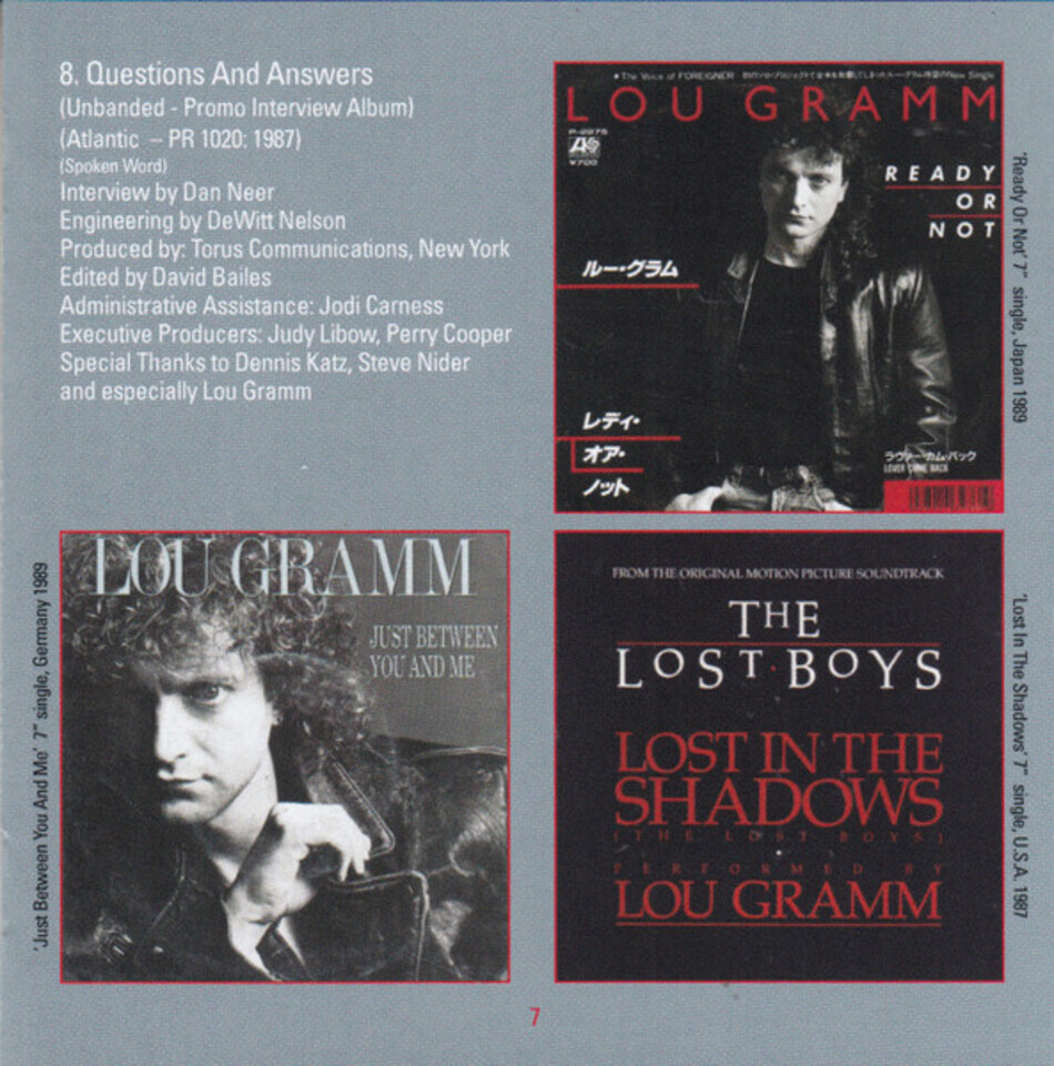 "Questions And Answers (The Atlantic Anthology 1987-1989)" - сборник американского рок-певца и автора песен Лу Грэмма, выпущенный в 2021 году. Релиз содержит дебютный сольный студийный альбом "Ready or Not", второй альбом "Long Hard Look", а также собрание сингловых версий и интервью на третьем CD.