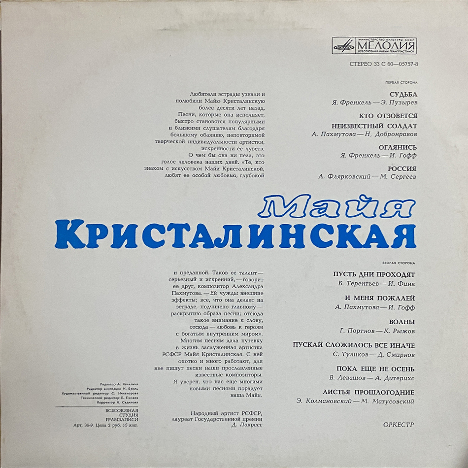 Майя Владимировна Кристалинская (1932–1985) - заслуженная артистка РСФСР (1974), советская эстрадная певица, не имевшая профессионального музыкального образования, но добившаяся большого успеха: солистка Москонцерта с 1961 года, частая гостья Всесоюзного радио и Центрального телевидения.