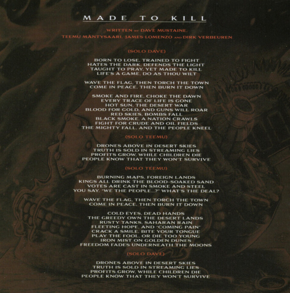 Megadeth - американская трэш-метал группа из Лос-Анджелеса, образовалась в 1983 году. Коллектив основан гитаристом и вокалистом Дэйвом Мастейном и бас-гитаристом Дэвидом Эллефсоном после того, как Мастейн был уволен из группы Metallica. Группа является одним из самых коммерчески успешных трэш-метал коллективов, продав более 50 миллионов альбомов по всему миру. За всю карьеру в Megadeth официально участвовало более двадцати музыкантов, и лишь Дэйв Мастейн остаётся лидером группы ещё с первого состава и основным автором песен. Megadeth входит в "большую четвёрку" самых успешных коммерческих трэш-метал проектов (наряду со Slayer, Metallica и Anthrax).