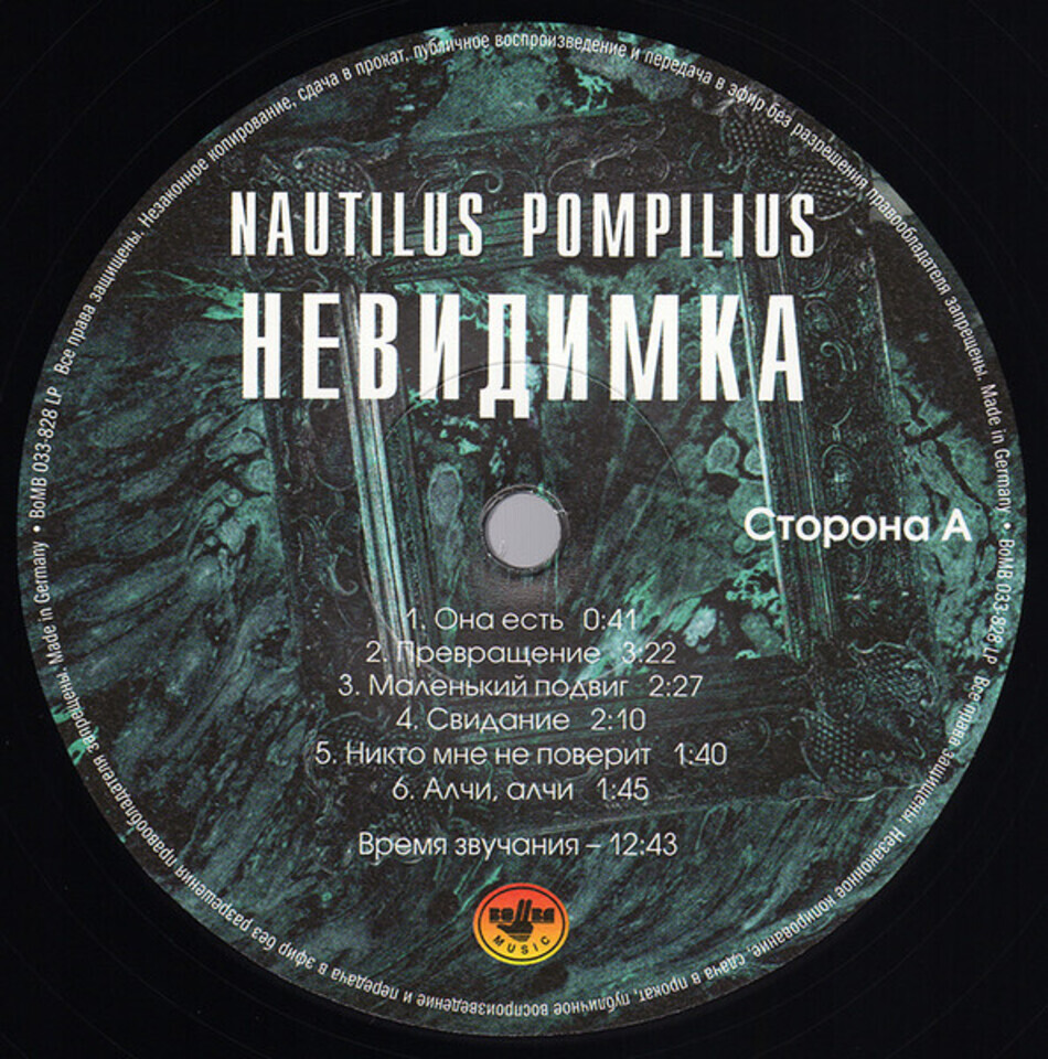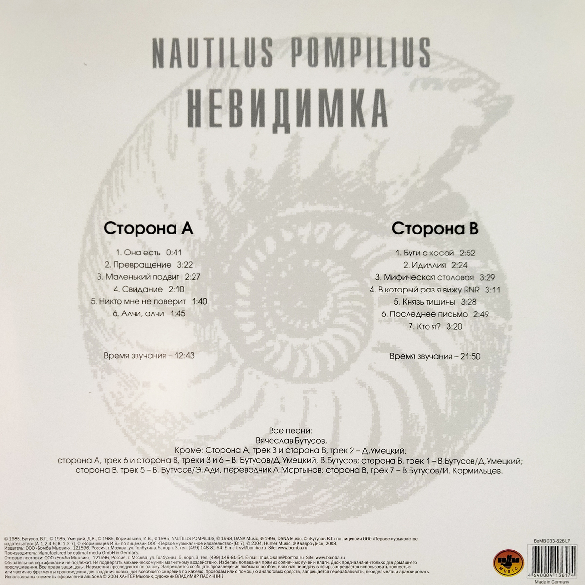 "Невидимка" - второй студийный альбом рок-группы Nautilus Pompilius, записанный в 1985 году и официально изданный только в 1994 году. Альбом записан с февраля по март 1985 года в однокомнатной квартире. В отличие от поздних альбомов "Наутилуса", тексты почти всех песен (кроме "Кто я?" и "Князь тишины") были написаны Вячеславом Бутусовым и Дмитрием Умецким. Альбом "Невидимка" стал первым, записанным под названием Nautilus Pompilius (название предложил Илья Кормильцев). Автор текста "Кто я?" - Илья Кормильцев.