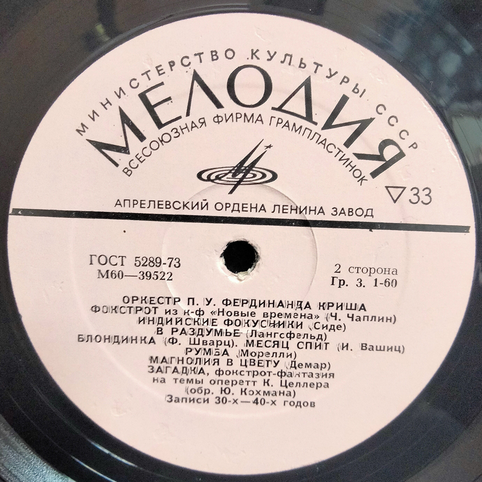 "Оркестр Под Управлением Фердинанда Криша" - альбом оркестра под управлением Фердинанда Криша, выпущенный в 1977 году. Записи 1930-1940-х годов.