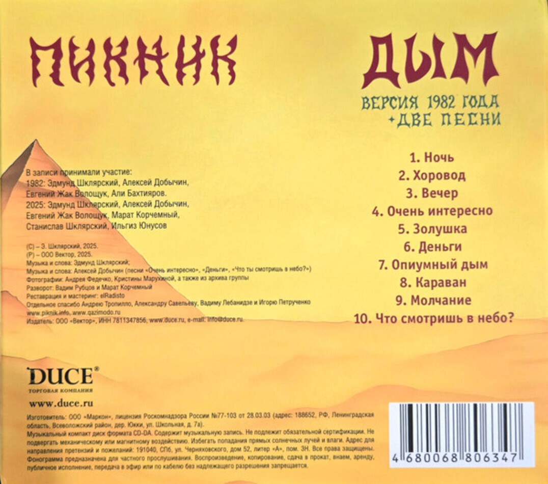 "Дым" - студийный альбом советской и российской рок-группы Пикник, выпущенный в 1993 году. Альбом считается их самым первым, дебютным профессиональным творением, который был создан 1982 году и в 1993 году был перезаписан в студийных условиях. Для этого важного события собрали весь первоначальный состав и позже выпустили CD диск. В альбом вошли такие известные композиции, как: "Ночь", "Карнавал" и "Золушка".