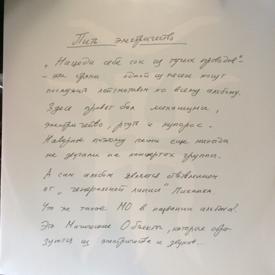 "Пить Электричество" - студийный альбом советской и российской рок-группы Пикник, выпущенный в 1998 году. Как сказал лидер группы Пикник Шклярский: ""Пить Электричество" - не "номерной" альбом Пикника, а ответвление, экспериментальная работа". Чтобы показать это отличие, был сделан необычный ход - было заявлено, что пластинка написана совместно с группой "Секта МО". На самом деле такой группы никогда не существовало - её выдумал сам Шклярский. "Пить Электричество" действительно не похож на все остальные работы Пикника. Голос вокалиста искажен до неузнаваемости, вся музыка написана на компьютере (Шклярским в одиночку), а из 9 треков только на 4 есть тексты.
