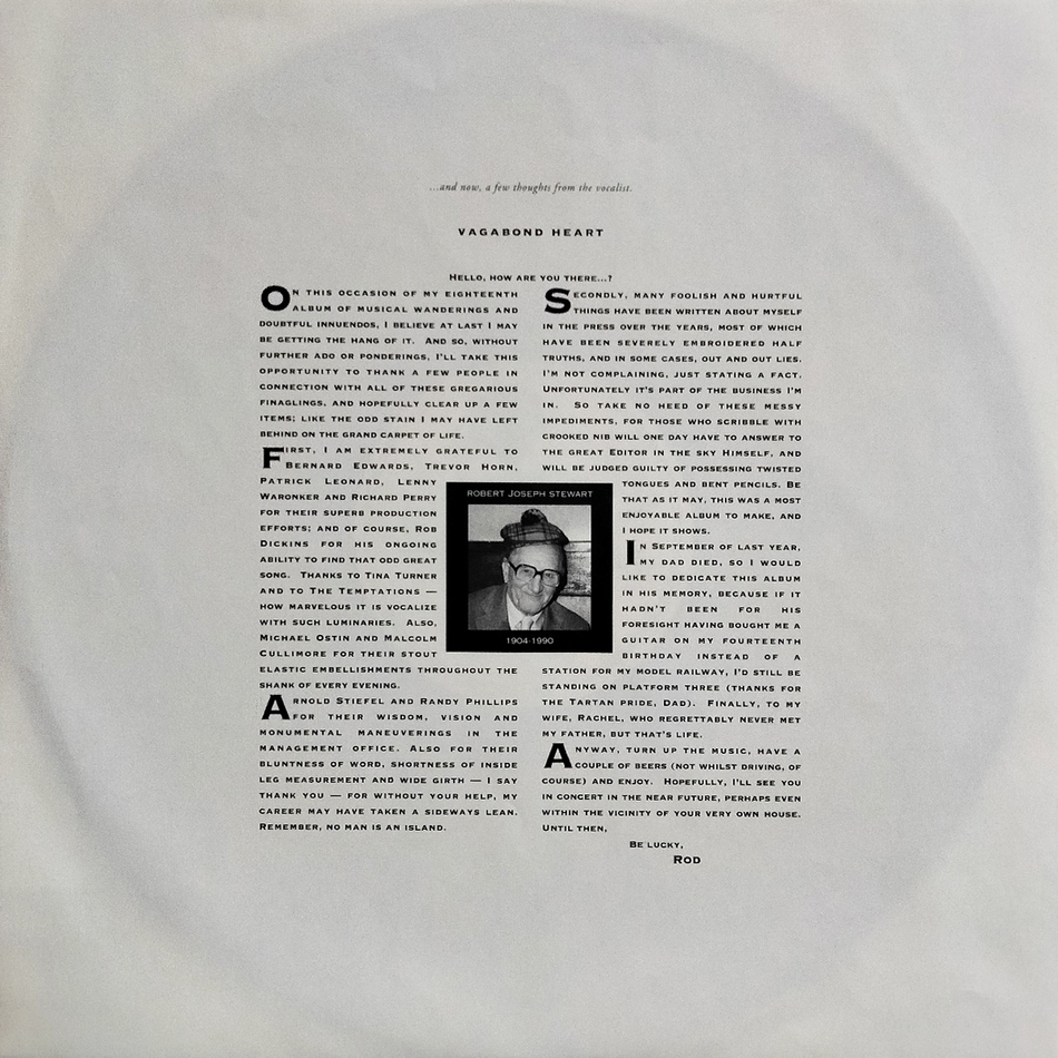 "Vagabond Heart" - шестнадцатый студийный альбом британского певца и рок-музыканта Рода Стюарта, выпущенный в 1991 году. Альбом достиг 10-го места в США и 2-го места в Великобритании. В альбом вошли пять синглов, среди которых кавер-версия песни Робби Робертсона "Broken Arrow" (20-е место в США) и песня Вана Моррисона "Have I Told You Lately", которая стала хитом два года спустя (в концертном исполнении) и является последним сольным хитом Стюарта, вошедшим в пятёрку лучших в США и Великобритании.