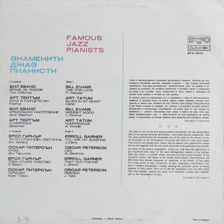 "Знаменити Джаз Пианисти - Famous Jazz Pianists" - сборник композиций известных джазовых пианистов, выпущенный в 1978 году. Среди исполнителей числятся: Билл Эванс, Арт Тейтум, Оскар Питерсон и многие другие.