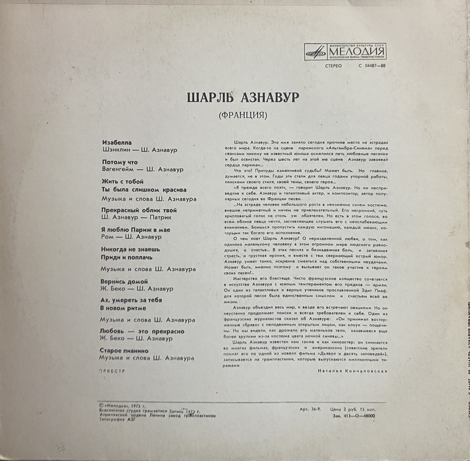 "Шарль Азнавур" - оригинальный советский сборник песен французского певца Шарля Азнавура, вышедший в 1973 году. Текст песен - Ш. Азнавур, Патрик. Музыка – Ш. Азнавур, Вагенгейм, Ж. Беко, Ром, Шэнклин.