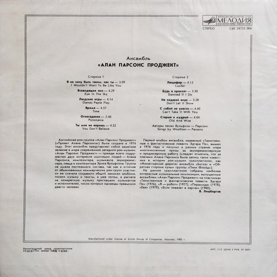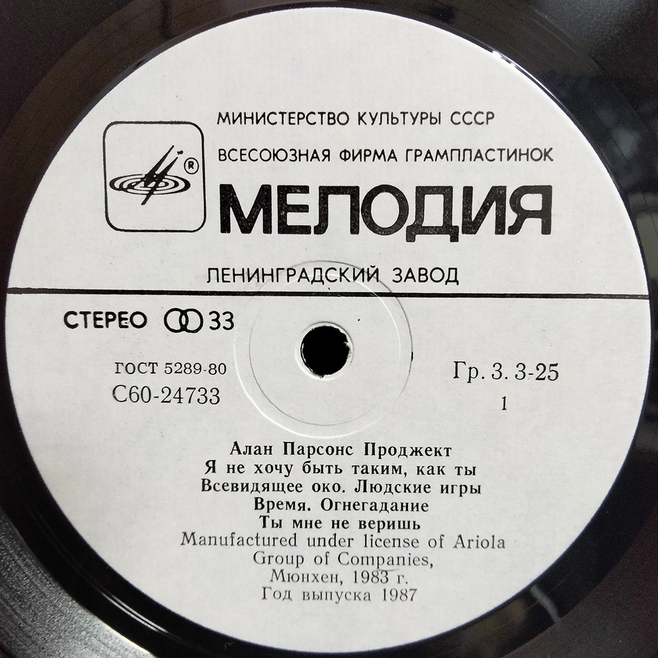 Советское повторное издание 1987 года на чёрном виниле. Конверт и винил в состоянии, близком к идеальному. Конверт в ПВХ пленке. Лейблы белые.