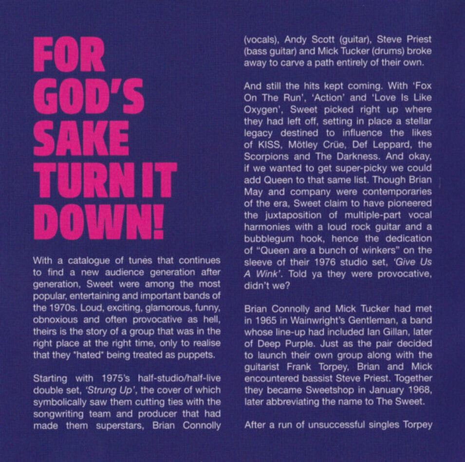 Sweet - британская рок-группа, образовавшаяся в Лондоне в 1968 году. Первую известность Sweet получили в начале 1970-х годов, стали частью британского глэм-рок-движения, а потом приблизились к хард-року. Впоследствии группа Sweet раскололась на две версии: одну возглавляет гитарист Энди Скотт, другую - басист Стив Прист.