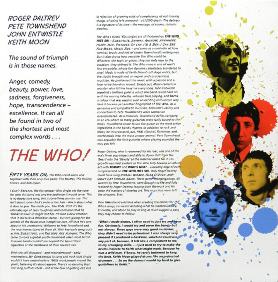 The Who - британская рок-группа, созданная в 1964 году. Первый успех пришел к The Who в 1965 году с выпуском сингла "I Can't Explain" и дебютного альбома "My Generation" того же года. Коллектив прославился за счёт неординарных концертных выступлений, на которых музыканты даже разбивали инструменты на сцене. Группа выпустила ряд очень успешных хит-синглов и альбомов, многие из которых получили серебряный, золотой и платиновый статусы. В 1978 году умер ударник Кит Мун, и его место занял Кенни Джонс из The Small Faces. В 1983 команда распалась, но после этого они несколько раз воссоединялись и выступали на особых событиях.