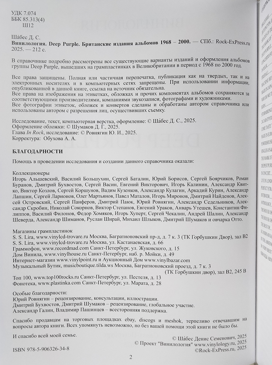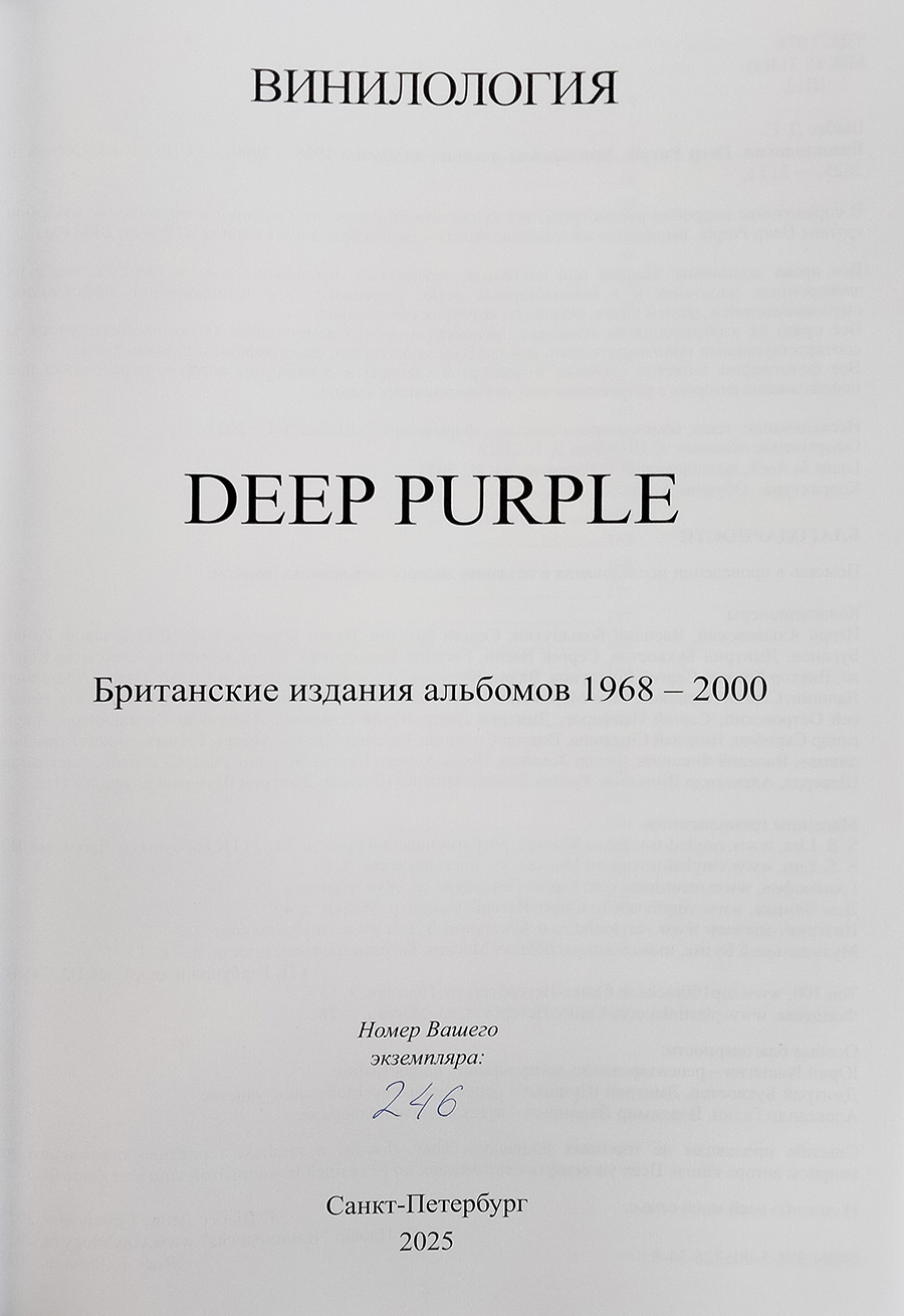 "Винилология. Deep Purple. Британские издания альбомов 1968-2000" - фундаментальное исследование Дениса Шабеса, представляющее собой исчерпывающий справочник по всем британским виниловым изданиям легендарной рок-группы. Книга содержит детальное описание каждой версии альбомов, включая редкие вариации обложек, этикеток, матриц и внутренних конвертов, с точной датировкой всех изданий. В издании представлено более 900 иллюстраций высокого качества, подробно описывающих первые прессы, допечатки, контрактные тиражи и различные варианты выпуска. Объём книги составляет 212 страниц в твёрдом переплёте, где каждый экземпляр альбома проанализирован вплоть до мельчайших деталей, что делает её незаменимым пособием как для коллекционеров, так и для всех ценителей качественного музыкального издания.