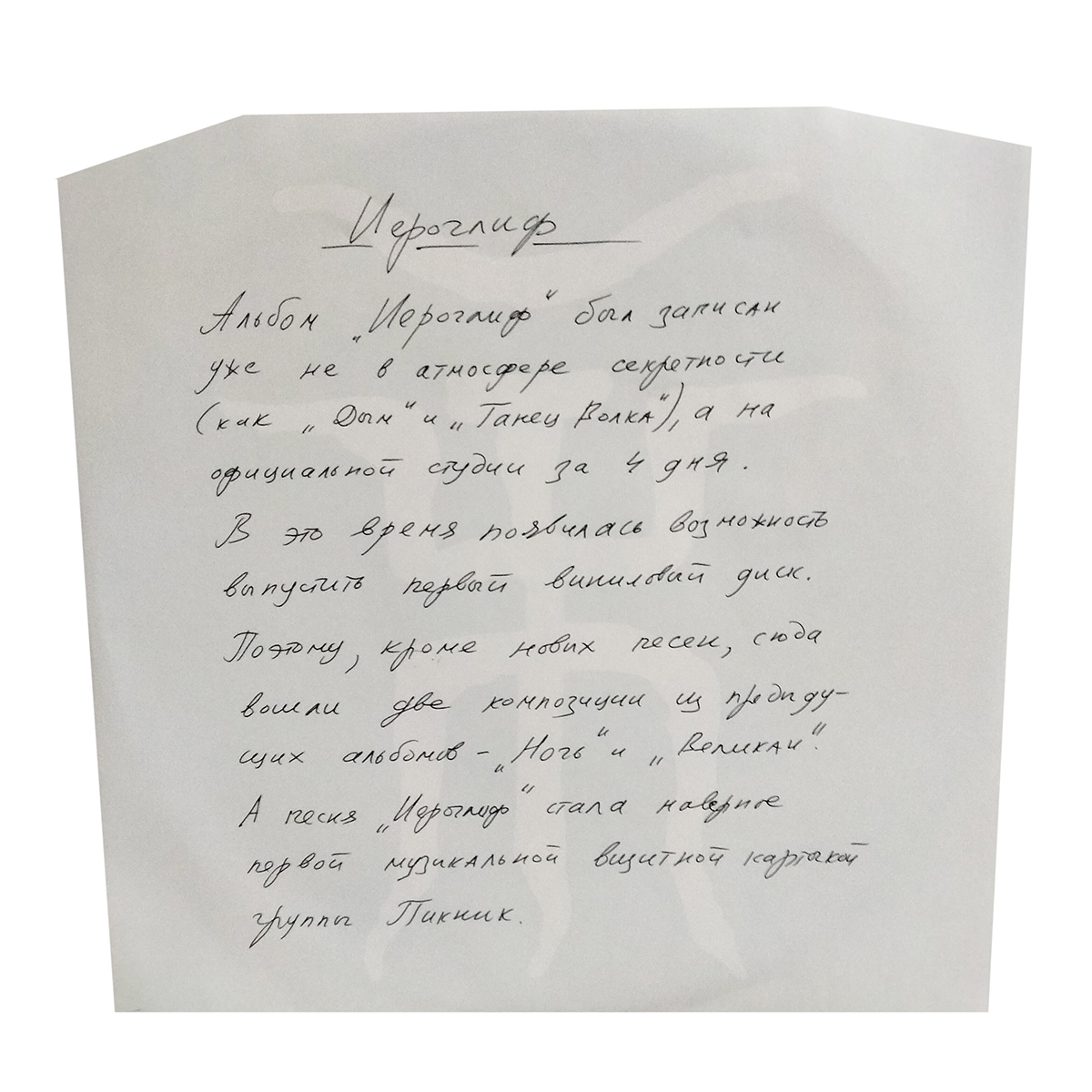 "Иероглиф" - третий студийный альбом советской и российской рок-группы Пикник, выпущенный в 1987 году. Именно с его выходом коллектив начал обретать популярность. О нём заговорили, стали активно ходить на концерты и стараться достать альбомы. Это первая запись с новым клавишником Сергеем Воронином, который перебрался в Пикник из группы Зеркало.