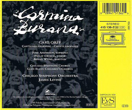"Carmina Burana" - сценическая кантата композитора Карла Орфа в исполнении оперных певцов Джуна Андерсона, Бернда Вайкля и Филиппа Крича с участием Чикагского симфонического оркестра, включая хор и под руководством дирижера Джеймса Ливайна.