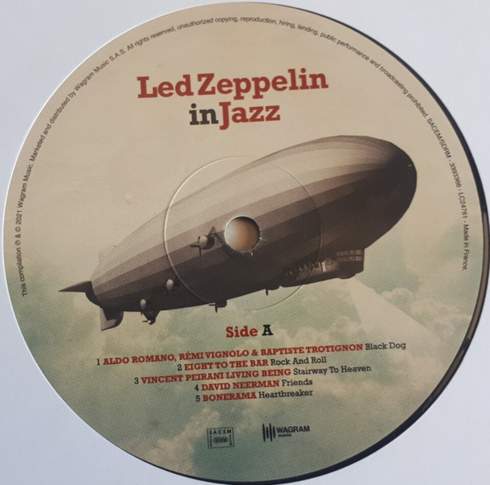 "Led Zeppelin In Jazz — A Jazz Tribute To Led Zeppelin" - трибьют-компиляция джазовых интерпретаций известных хитов группы Led Zeppelin, первоначально выпущенная в 2021 году. Релиз представляет собой трибьют-альбом на песни группы от различных коллективов, где рок-хиты переосмыслены в стилях от фьюжн до традиционного джаза. Среди исполнителей числятся Eight To The Bar, The Electric Kings, Bonerama и прочие. Содержит такие треки как "Black Dog", "Rock And Roll", "Stayrway To Heaven" и многие другие. Релиз серии In Jazz Collection.