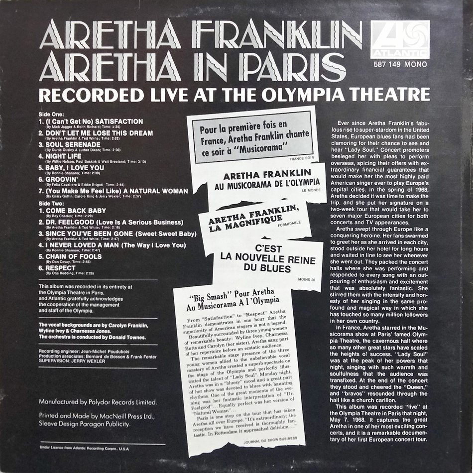 "Aretha In Paris" - концертный альбом американской певицы Ареты Франклин, выпущенный в 1968 году. Альбом был записан в Париже, Франция, 7 мая 1968 года. Он вошел в топ-20 альбомного чарта Billboard.