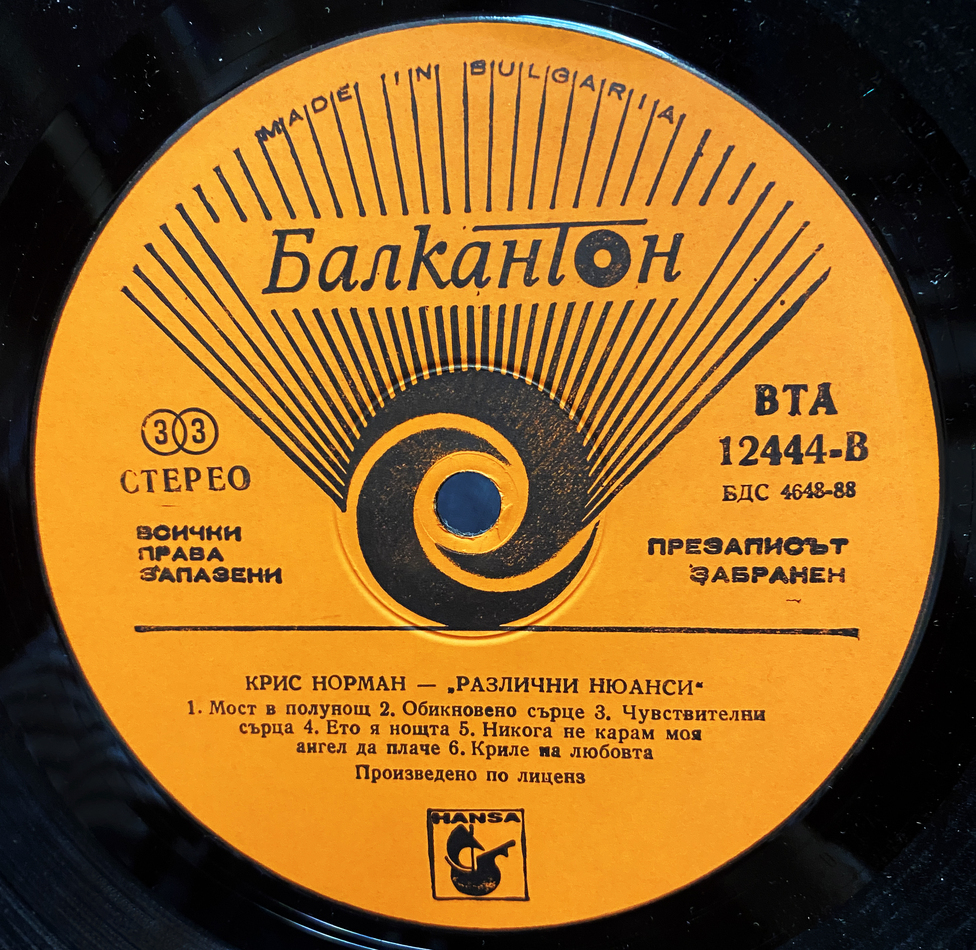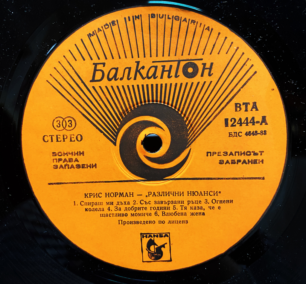Болгарское переиздание 1990 года на чёрном виниле. Конверт в превосходном состоянии, винил в состоянии, близком к идеальному. Лейблы оранжевые.