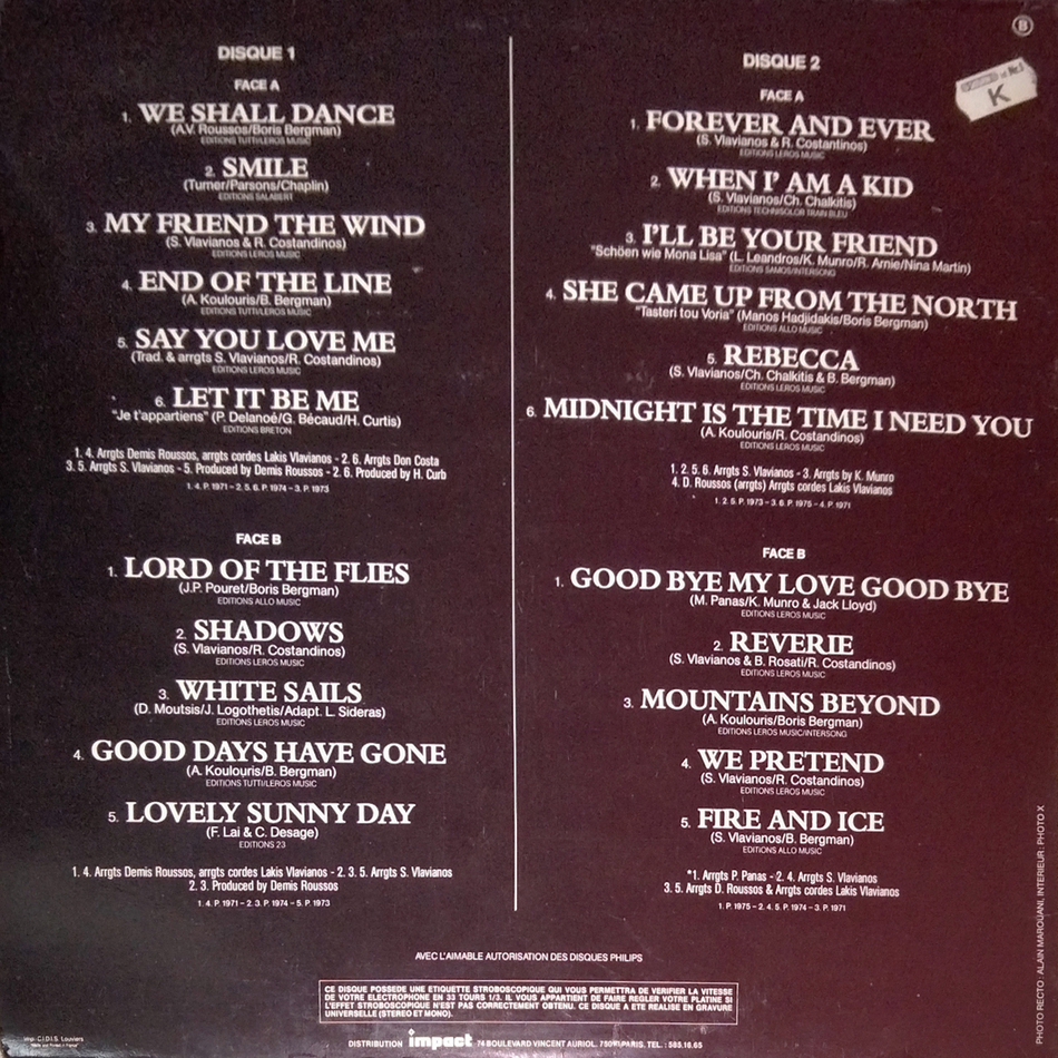 "Album 2 Disques" - сборник греческого певца Демиса Руссоса, выпущенный в 1977 году. Содержит такие треки как "We Shall Dance", "Smile", " My Friend The Wind" и многие другие.