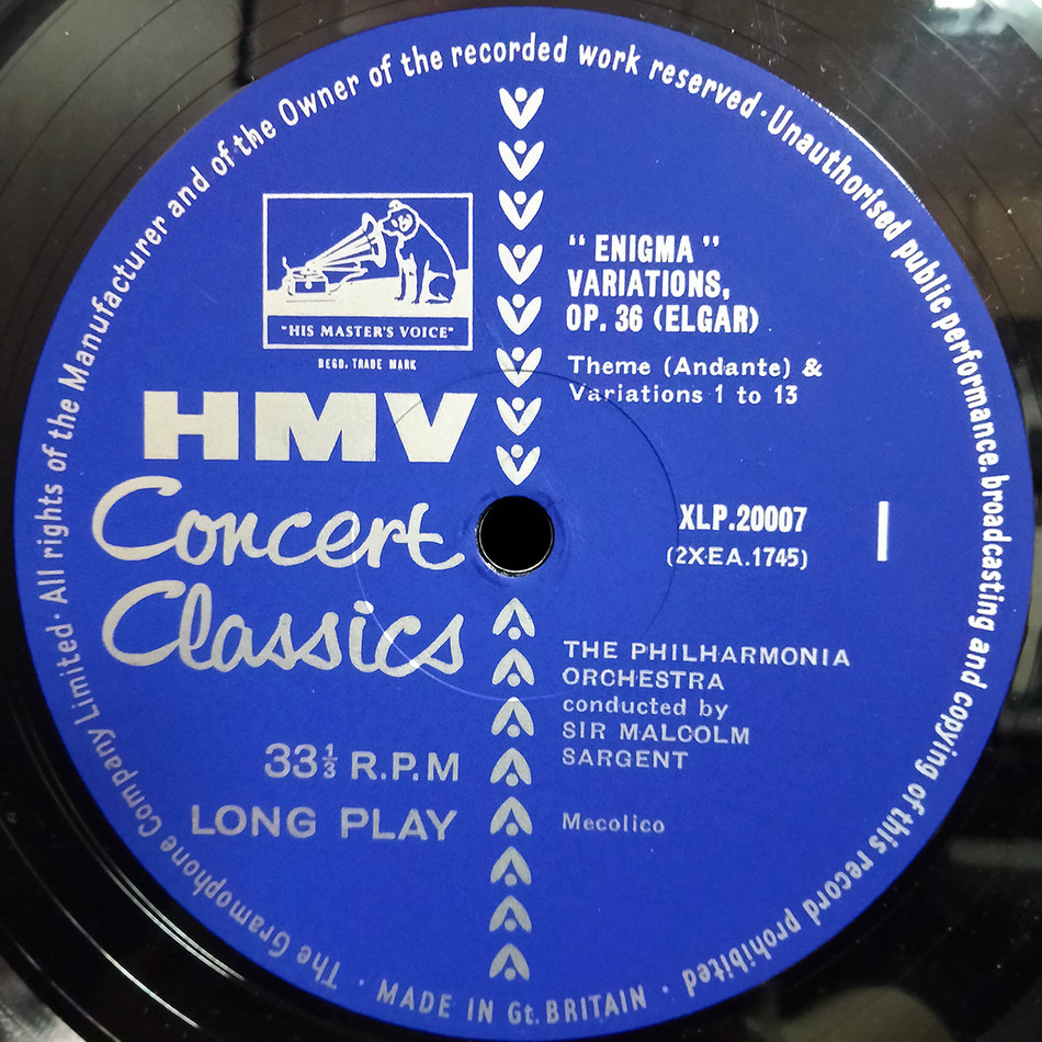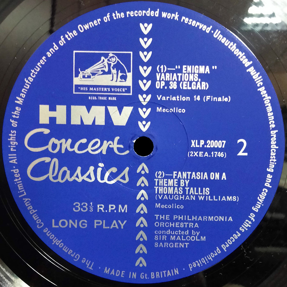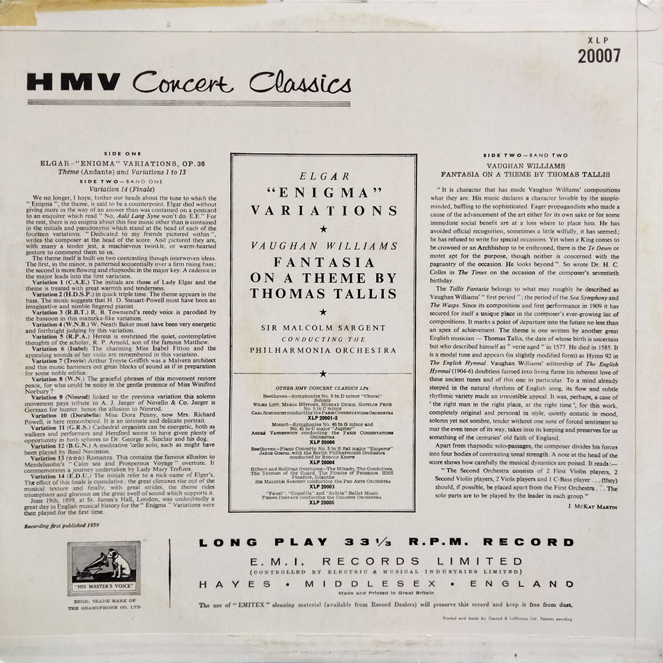 "The Enigma Variations - Fantasia On A Theme By Thomas Tallis" - издание двух знаковых произведений английского композитора Эдварда Элгара в исполнении Филармонического оркестра под управлением сэра Малкольма Саржента, выпущенное в 1959 году. В релиз вошли "Энигма‑вариации" (Enigma Variations, 1899) - цикл из 14 вариаций, каждая из которых изображает одного из друзей композитора, а также "Фантазия на тему Томаса Таллиса" (Fantasia on a Theme by Thomas Tallis, 1910) - медитативное сочинение для струнного оркестра, вдохновлённое музыкой эпохи Возрождения.