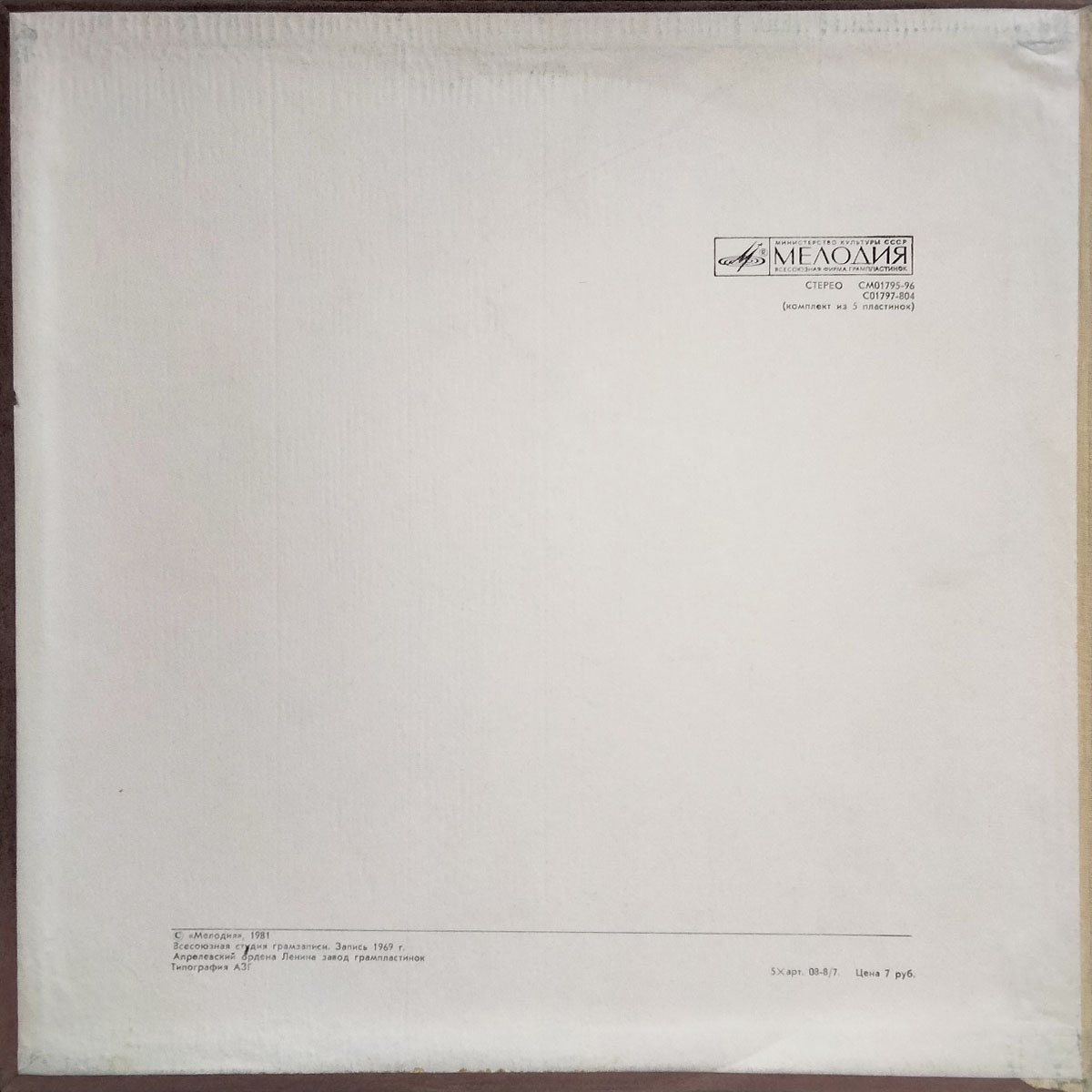 Советское бокс-сет переиздание 1981 года на пяти виниловых пластинках черного цвета. Содержит 2-страничную вкладку. Открытый бокс в превосходном состоянии, винил в идеальном состоянии. Лейблы белые.
