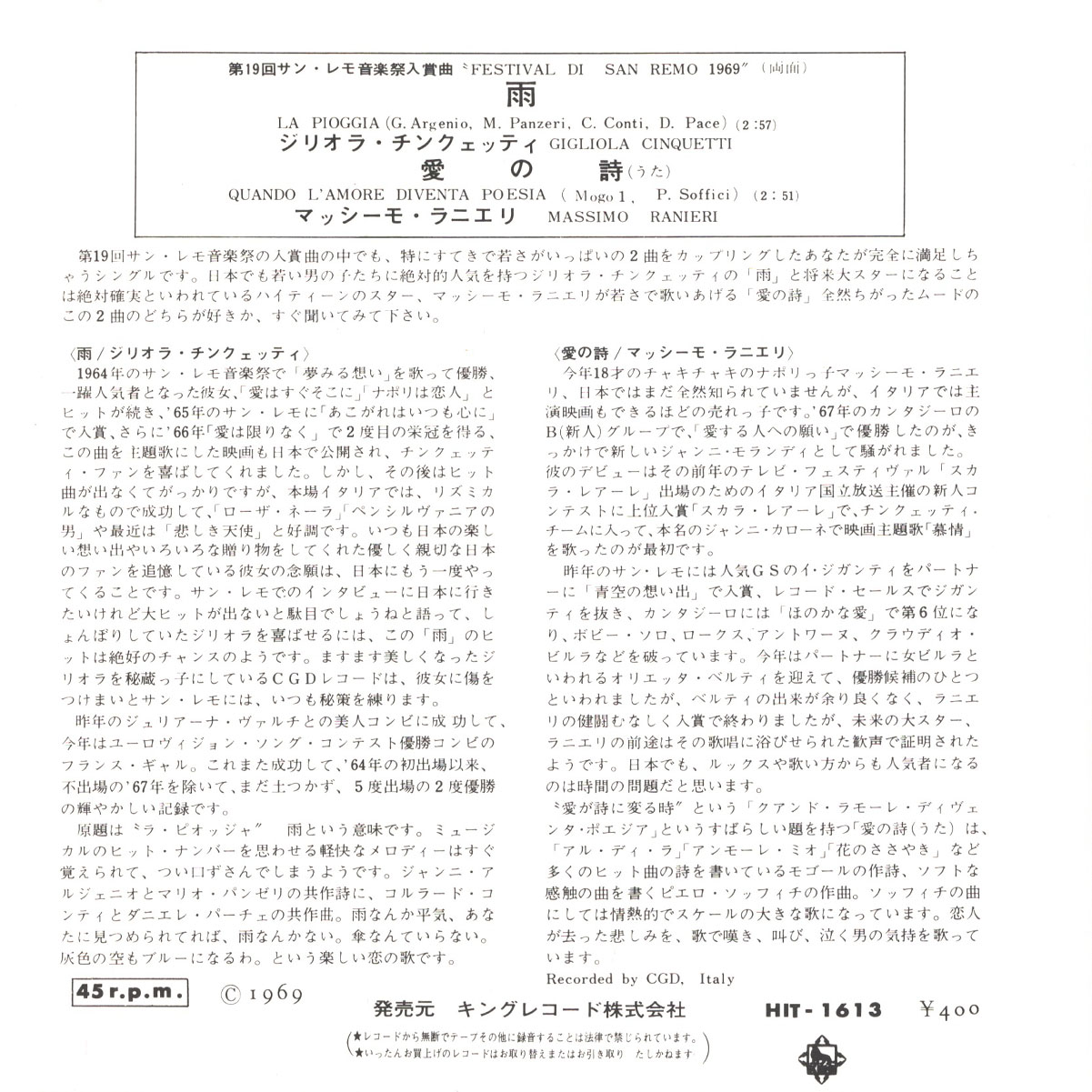 "La Pioggia - Quando L'Amore Diventa Poesia" - сингл Джильолы Чинкетти и Массимо Раньери, выпущенный в 1969 году. Релиз содержит два трека: "Gigliola Cinquetti - La Pioggia" и "Massimo Ranieri - Quando L'Amore Diventa Poesia". Записано во время фестиваля в Сан-Ремо 1969 года.