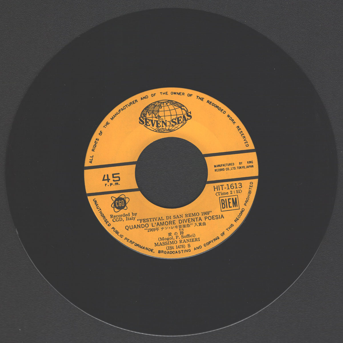 Японское издание на 7-дюймовом чёрном виниле. Скорость записи 45 RPM. Конверт в состоянии, близком к идеальному, винил в превосходном.