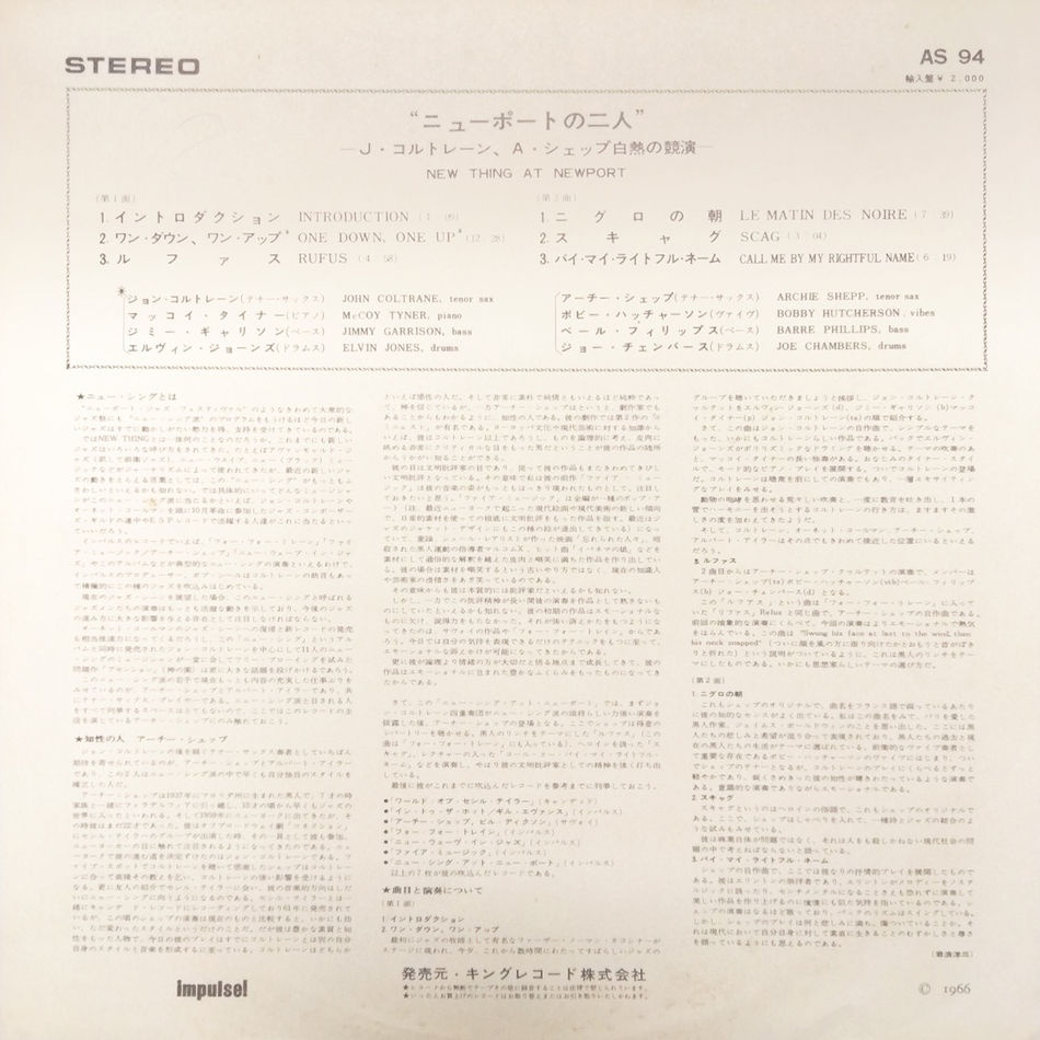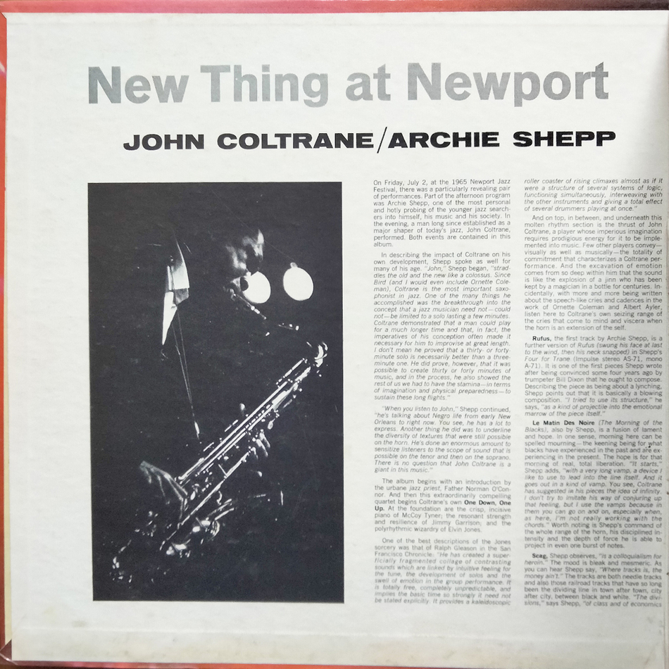 "New Thing At Newport" - концертный альбом Джона Колтрейна и Арчи Шеппа, выпущенный в 1966 году. Альбом состоит из двух отдельных сетов, записанных на джазовом фестивале в Ньюпорте 1966 года тенор-саксофонистами Джоном Колтрейном и Арчи Шеппом. Релиз был записан через четыре дня после записи альбома Колтрейна "Ascension", в записи которого принял участие Шепп, и является одним из нескольких альбомов, документирующих закат "классического квартета" Колтрейна, который начал распадаться к концу того же года с уходом Маккоя Тайнера. Мастеринг выполнен Ван Гелдером.