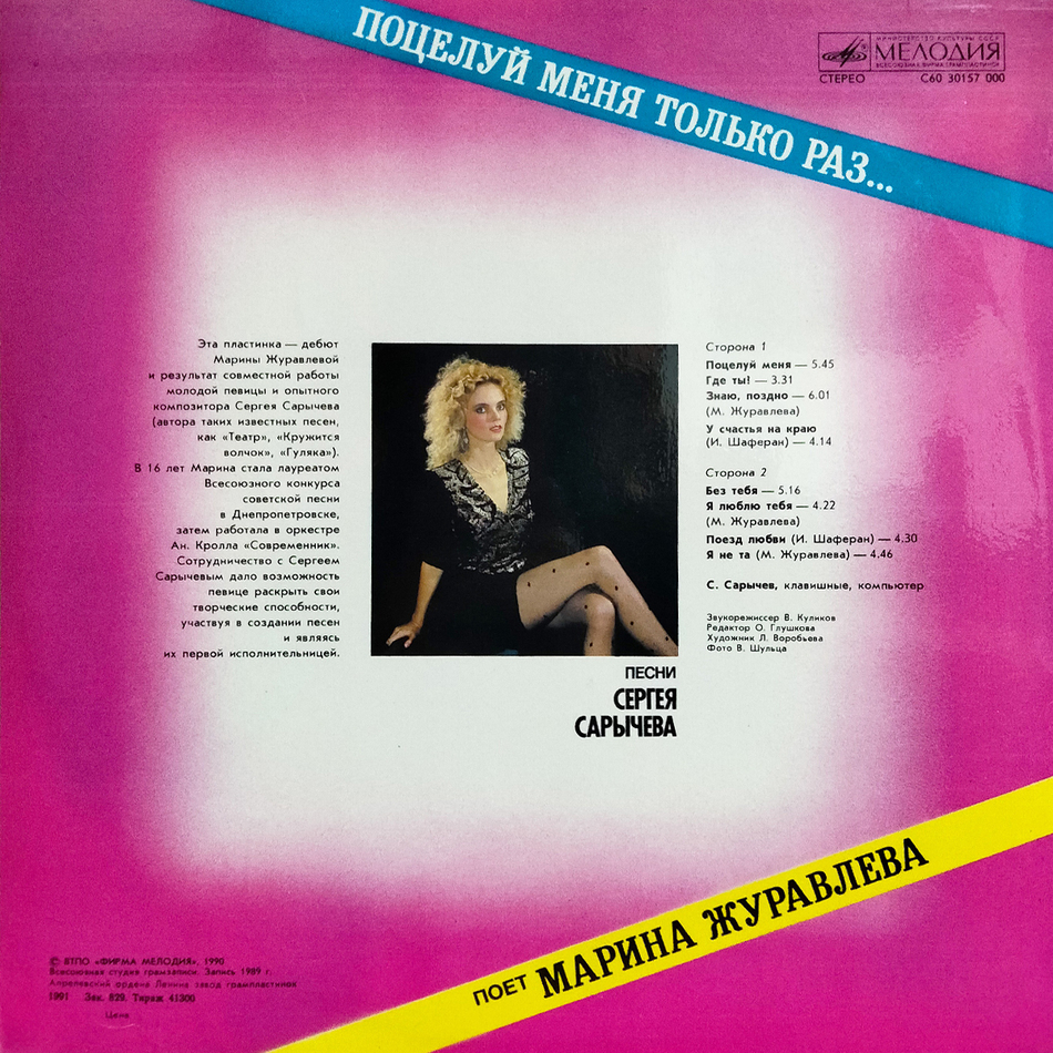 Марина Анатольевна Журавлёва - известная советская и российская певица, автор песен и композитор, родившаяся 8 июля 1963 года в Хабаровске. Стала популярной в начале 1990-х годов благодаря исполнению лирических шлягеров о любви. За свою карьеру выпустила несколько альбомов, среди которых "Поцелуй меня только раз", "Алые гвоздики", "Белая черёмуха", "Пусть говорят", "Играй, гитара" и другие.