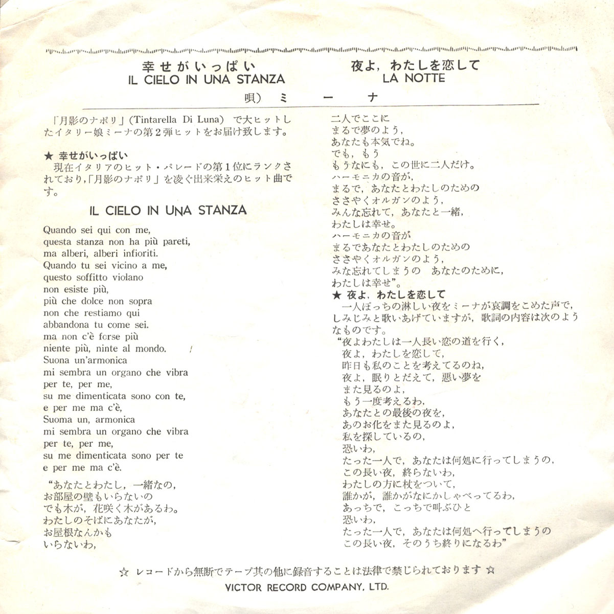"Il Cielo in Una Stanza" - сингл итальянской певицы Мины, выпущенный в 1960 году. Релиз содержит два трека - "Il Cielo In Una Stanza" и "La Notte". "Il cielo in una stanza" - песня, написанная Джино Паоли и первоначально записанная итальянской певицей Миной для одноименного альбома. Она имела коммерческий успех в Италии, возглавляя чарты одиннадцать недель подряд, а затем вернувшись на первое место еще на три недели. Это также самый продаваемый сингл Мины в Италии, с предполагаемыми продажами в 400 000 экземпляров и более 8 миллионов по всему миру.