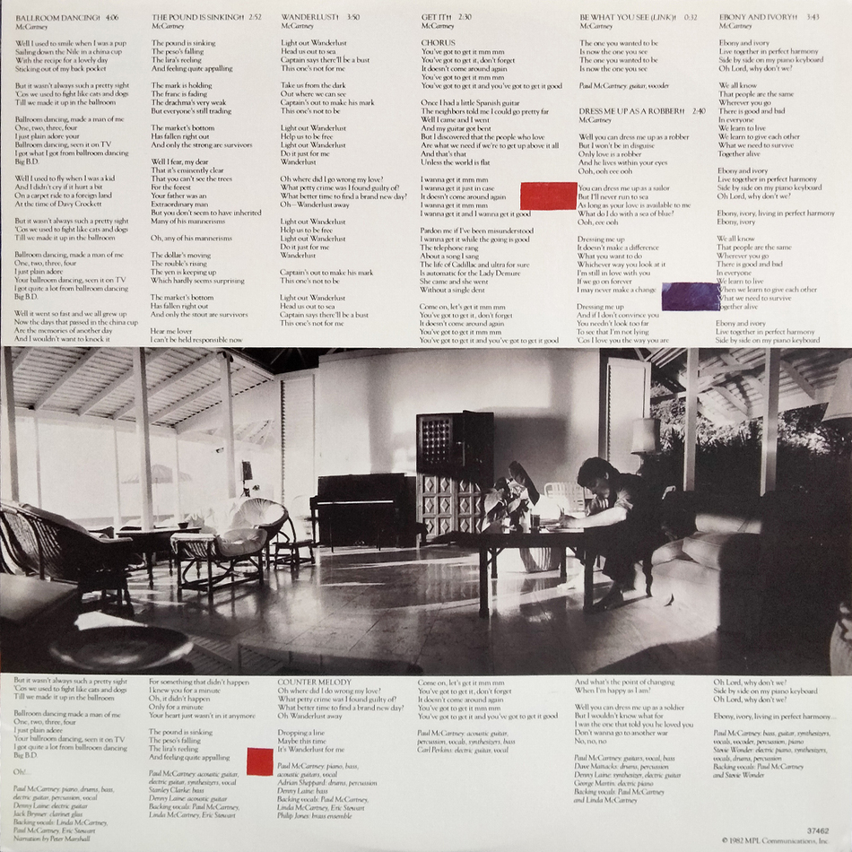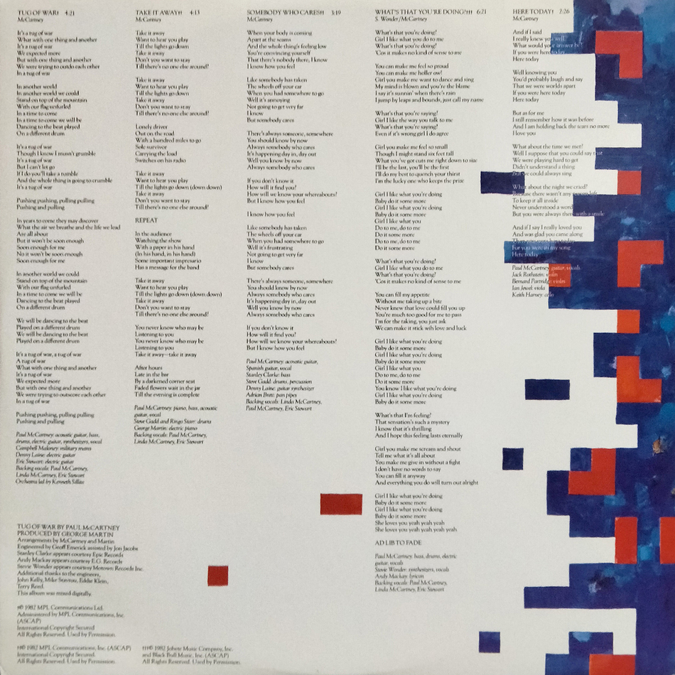 "Tug Of War" - третий студийный альбом Пола Маккартни, выпущенный в 1982 году. Альбом является следующим сольным альбомом Маккартни после вышедшего в 1980 году "McCartney II"; это первый официальный сольный альбом Маккартни, вышедший после распада группы Wings в апреле 1981 года. На сессиях звукозаписи для альбома Маккартни снова начал работать с продюсером и звукорежиссёром Джорджем Мартином, с которым работал во время своего участия в группе The Beatles, а также при записи своих первых сольных альбомов.