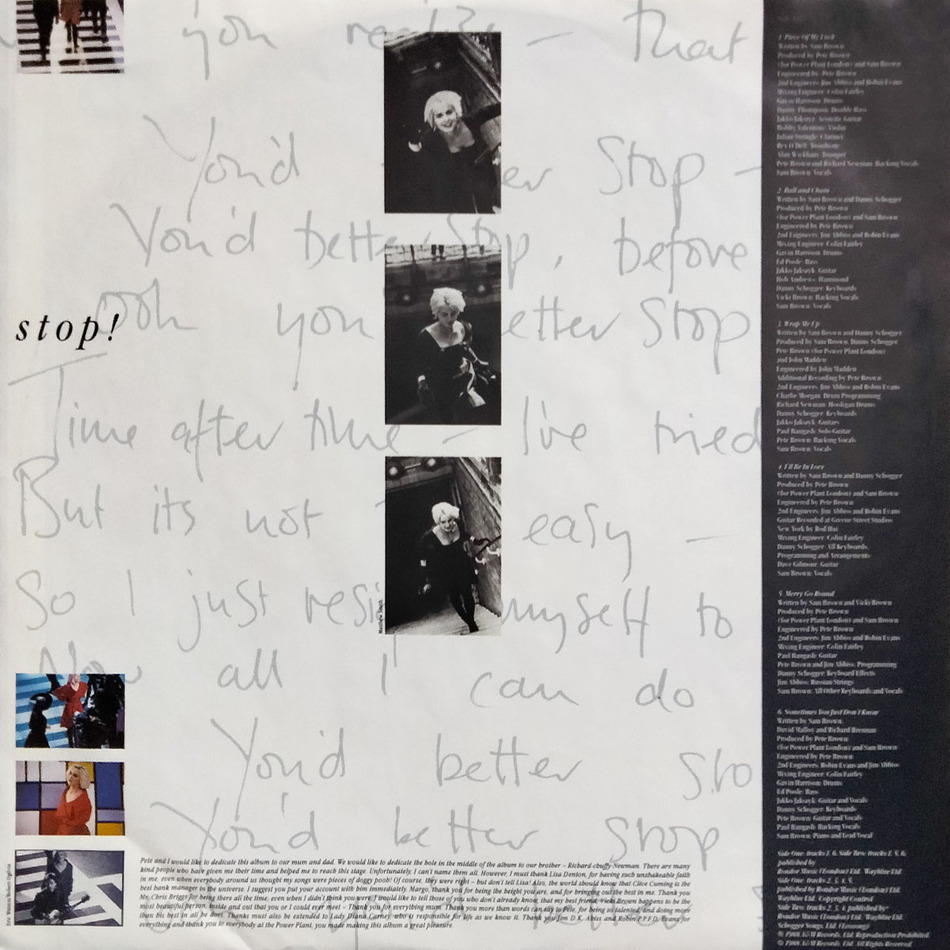 "Stop!" - дебютный студийный альбом певицы и автора песен Сэм Браун, выпущенный в 1988 году. В него входит самый известный сингл Браун - заглавная песня "Stop!". Продюсерами альбома выступили Сэм Браун, её брат Пит Браун, Пит Смит, Дэнни Шоггер и Джон Мэдден. Запись проходила на студии Power Plant в Лондоне, а гитарные партии Дэвида Гилмора, тогдашнего участника Pink Floyd, в песнях "This Feeling" и "I'll Be in Love" были записаны в студии Greene Street Studios в Нью-Йорке.